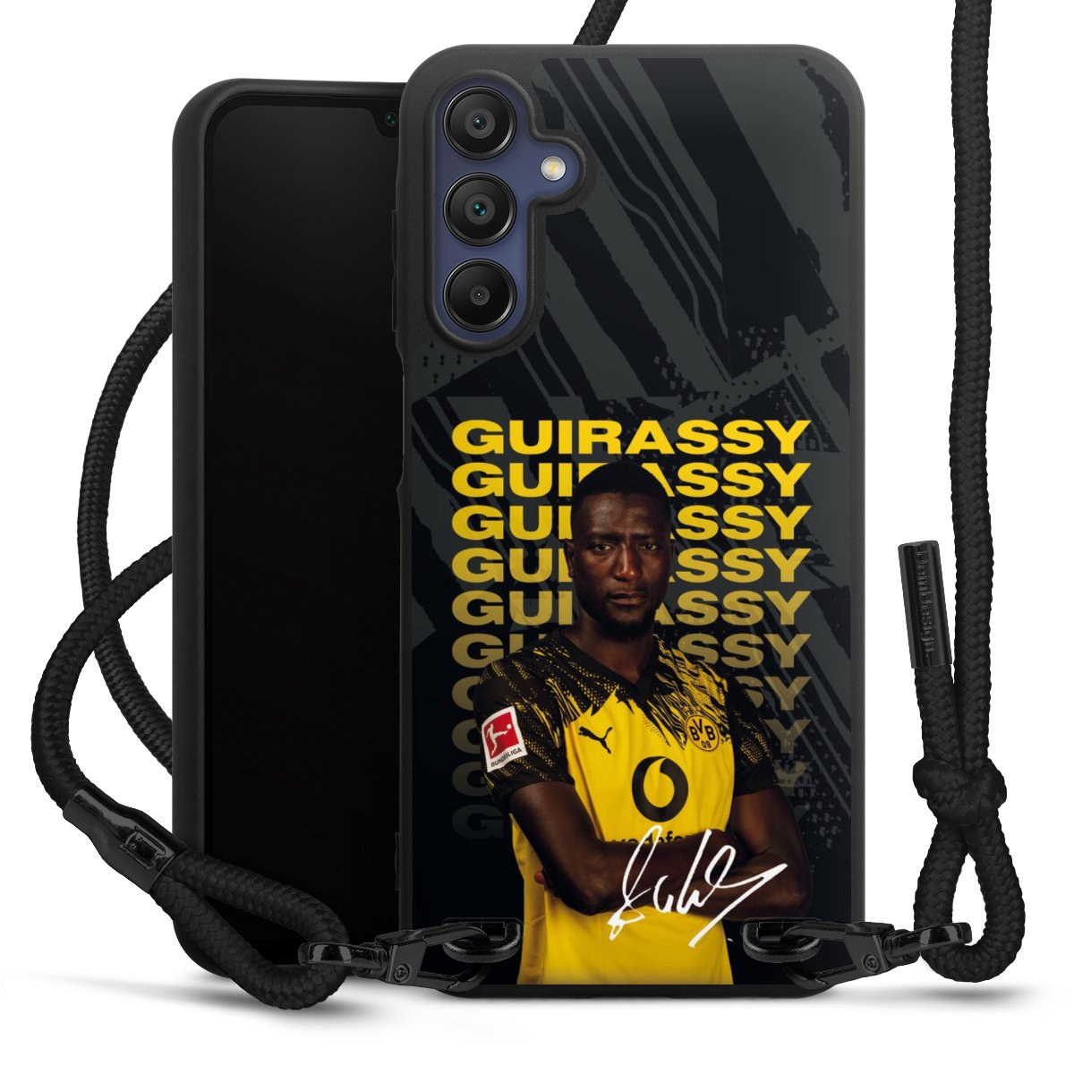 The matt black silicone case is made of flexible TPU (thermoplastic polyurethane) and offers robust protection. The durable, unbreakable material makes the cover flexible and dimensionally stable at the same time. The matte surface makes your design stand out more and is less susceptible to fingerprints and dirt. The stylish trend accessory fits comfortably in the hand and is perfectly complemented by the fabric (polyester) mobile phone strap. The braided fabric strap is approx. 1.70 metres long with a diameter of approx. 0.5 cm. Due to the special knotting technique, the length of the strap can be adjusted by simply pulling it, so that you can adapt it individually to your wishes. The practical case to wear around your neck is available with the fabric strap in black. As a little icing on the cake, we have provided the strap with a chic metal fastener in matt black. The strap is securely fastened to the case with loops made of high-quality genuine leather and press studs. The ends of the fabric strap are covered with metallic end caps and thus protected from fraying.