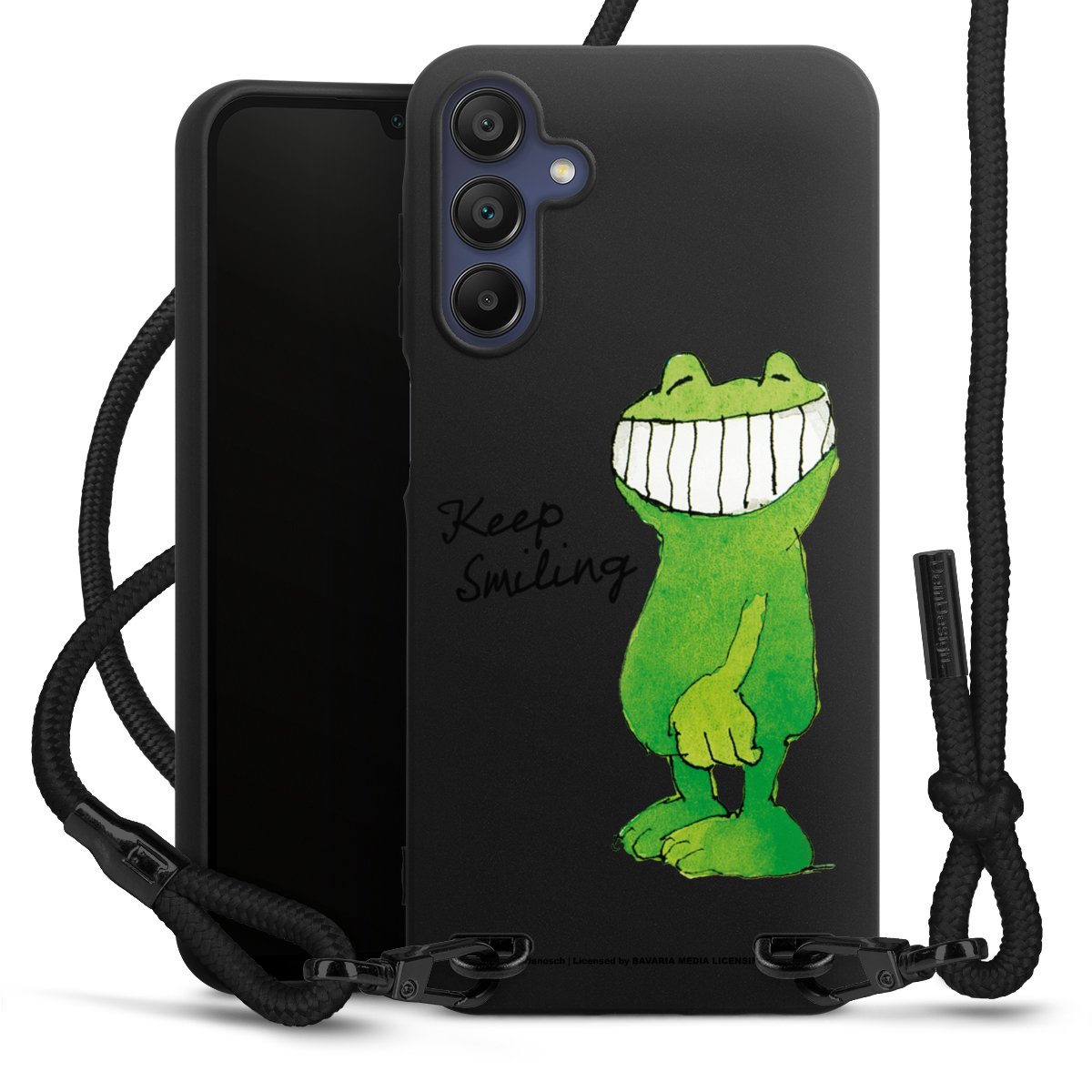The matt black silicone case is made of flexible TPU (thermoplastic polyurethane) and offers robust protection. The durable, unbreakable material makes the cover flexible and dimensionally stable at the same time. The matte surface makes your design stand out more and is less susceptible to fingerprints and dirt. The stylish trend accessory fits comfortably in the hand and is perfectly complemented by the fabric (polyester) mobile phone strap. The braided fabric strap is approx. 1.70 metres long with a diameter of approx. 0.5 cm. Due to the special knotting technique, the length of the strap can be adjusted by simply pulling it, so that you can adapt it individually to your wishes. The practical case to wear around your neck is available with the fabric strap in black. As a little icing on the cake, we have provided the strap with a chic metal fastener in matt black. The strap is securely fastened to the case with loops made of high-quality genuine leather and press studs. The ends of the fabric strap are covered with metallic end caps and thus protected from fraying.
