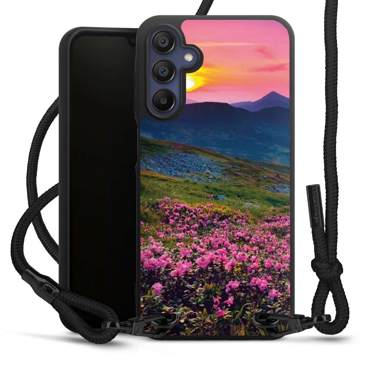 The matt black silicone case is made of flexible TPU (thermoplastic polyurethane) and offers robust protection. The durable, unbreakable material makes the cover flexible and dimensionally stable at the same time. The matte surface makes your design stand out more and is less susceptible to fingerprints and dirt. The stylish trend accessory fits comfortably in the hand and is perfectly complemented by the fabric (polyester) mobile phone strap. The braided fabric strap is approx. 1.70 metres long with a diameter of approx. 0.5 cm. Due to the special knotting technique, the length of the strap can be adjusted by simply pulling it, so that you can adapt it individually to your wishes. The practical case to wear around your neck is available with the fabric strap in black. As a little icing on the cake, we have provided the strap with a chic metal fastener in matt black. The strap is securely fastened to the case with loops made of high-quality genuine leather and press studs. The ends of the fabric strap are covered with metallic end caps and thus protected from fraying.