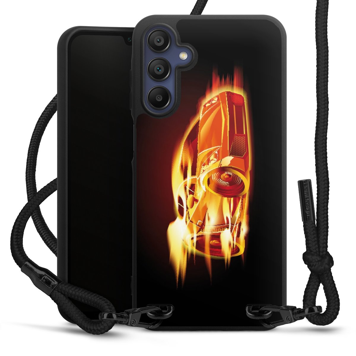 The matt black silicone case is made of flexible TPU (thermoplastic polyurethane) and offers robust protection. The durable, unbreakable material makes the cover flexible and dimensionally stable at the same time. The matte surface makes your design stand out more and is less susceptible to fingerprints and dirt. The stylish trend accessory fits comfortably in the hand and is perfectly complemented by the fabric (polyester) mobile phone strap. The braided fabric strap is approx. 1.70 metres long with a diameter of approx. 0.5 cm. Due to the special knotting technique, the length of the strap can be adjusted by simply pulling it, so that you can adapt it individually to your wishes. The practical case to wear around your neck is available with the fabric strap in black. As a little icing on the cake, we have provided the strap with a chic metal fastener in matt black. The strap is securely fastened to the case with loops made of high-quality genuine leather and press studs. The ends of the fabric strap are covered with metallic end caps and thus protected from fraying.