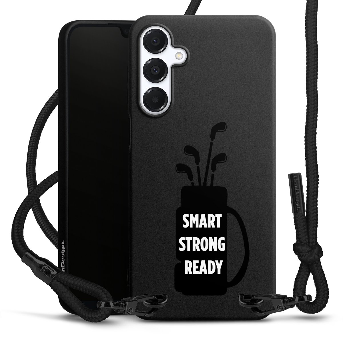 The matt black silicone case is made of flexible TPU (thermoplastic polyurethane) and offers robust protection. The durable, unbreakable material makes the cover flexible and dimensionally stable at the same time. The matte surface makes your design stand out more and is less susceptible to fingerprints and dirt. The stylish trend accessory fits comfortably in the hand and is perfectly complemented by the fabric (polyester) mobile phone strap. The braided fabric strap is approx. 1.70 metres long with a diameter of approx. 0.5 cm. Due to the special knotting technique, the length of the strap can be adjusted by simply pulling it, so that you can adapt it individually to your wishes. The practical case to wear around your neck is available with the fabric strap in black. As a little icing on the cake, we have provided the strap with a chic metal fastener in matt black. The strap is securely fastened to the case with loops made of high-quality genuine leather and press studs. The ends of the fabric strap are covered with metallic end caps and thus protected from fraying.
