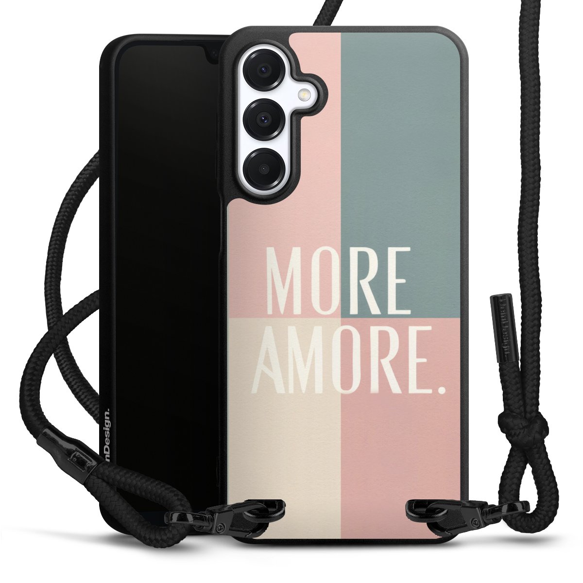 The matt black silicone case is made of flexible TPU (thermoplastic polyurethane) and offers robust protection. The durable, unbreakable material makes the cover flexible and dimensionally stable at the same time. The matte surface makes your design stand out more and is less susceptible to fingerprints and dirt. The stylish trend accessory fits comfortably in the hand and is perfectly complemented by the fabric (polyester) mobile phone strap. The braided fabric strap is approx. 1.70 metres long with a diameter of approx. 0.5 cm. Due to the special knotting technique, the length of the strap can be adjusted by simply pulling it, so that you can adapt it individually to your wishes. The practical case to wear around your neck is available with the fabric strap in black. As a little icing on the cake, we have provided the strap with a chic metal fastener in matt black. The strap is securely fastened to the case with loops made of high-quality genuine leather and press studs. The ends of the fabric strap are covered with metallic end caps and thus protected from fraying.