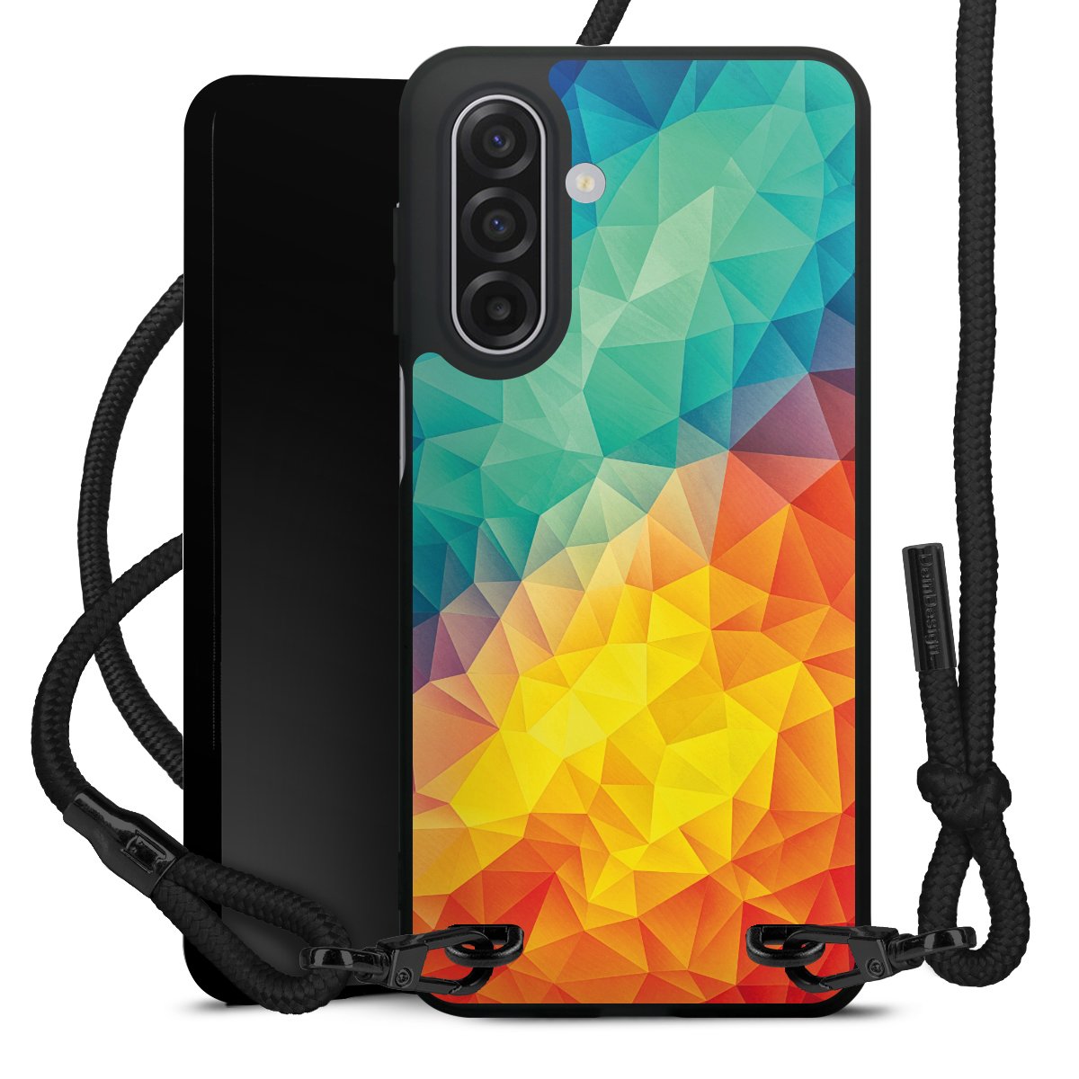 The matt black silicone case is made of flexible TPU (thermoplastic polyurethane) and offers robust protection. The durable, unbreakable material makes the cover flexible and dimensionally stable at the same time. The matte surface makes your design stand out more and is less susceptible to fingerprints and dirt. The stylish trend accessory fits comfortably in the hand and is perfectly complemented by the fabric (polyester) mobile phone strap. The braided fabric strap is approx. 1.70 metres long with a diameter of approx. 0.5 cm. Due to the special knotting technique, the length of the strap can be adjusted by simply pulling it, so that you can adapt it individually to your wishes. The practical case to wear around your neck is available with the fabric strap in black. As a little icing on the cake, we have provided the strap with a chic metal fastener in matt black. The strap is securely fastened to the case with loops made of high-quality genuine leather and press studs. The ends of the fabric strap are covered with metallic end caps and thus protected from fraying.