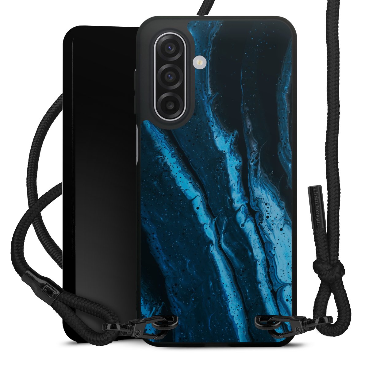 The matt black silicone case is made of flexible TPU (thermoplastic polyurethane) and offers robust protection. The durable, unbreakable material makes the cover flexible and dimensionally stable at the same time. The matte surface makes your design stand out more and is less susceptible to fingerprints and dirt. The stylish trend accessory fits comfortably in the hand and is perfectly complemented by the fabric (polyester) mobile phone strap. The braided fabric strap is approx. 1.70 metres long with a diameter of approx. 0.5 cm. Due to the special knotting technique, the length of the strap can be adjusted by simply pulling it, so that you can adapt it individually to your wishes. The practical case to wear around your neck is available with the fabric strap in black. As a little icing on the cake, we have provided the strap with a chic metal fastener in matt black. The strap is securely fastened to the case with loops made of high-quality genuine leather and press studs. The ends of the fabric strap are covered with metallic end caps and thus protected from fraying.