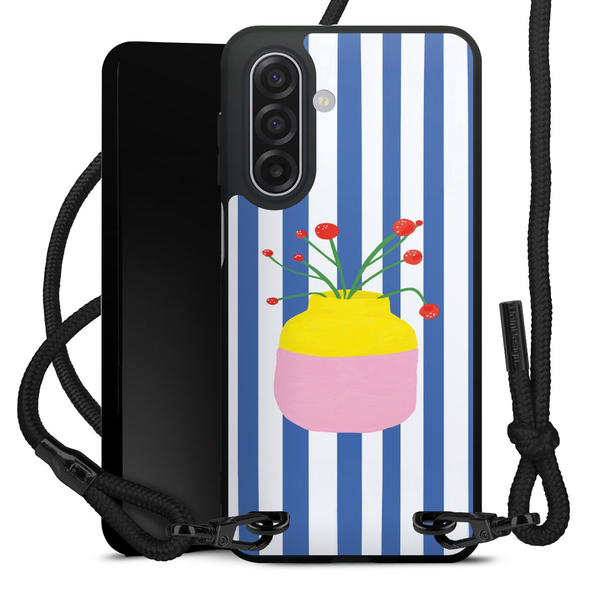 The matt black silicone case is made of flexible TPU (thermoplastic polyurethane) and offers robust protection. The durable, unbreakable material makes the cover flexible and dimensionally stable at the same time. The matte surface makes your design stand out more and is less susceptible to fingerprints and dirt. The stylish trend accessory fits comfortably in the hand and is perfectly complemented by the fabric (polyester) mobile phone strap. The braided fabric strap is approx. 1.70 metres long with a diameter of approx. 0.5 cm. Due to the special knotting technique, the length of the strap can be adjusted by simply pulling it, so that you can adapt it individually to your wishes. The practical case to wear around your neck is available with the fabric strap in black. As a little icing on the cake, we have provided the strap with a chic metal fastener in matt black. The strap is securely fastened to the case with loops made of high-quality genuine leather and press studs. The ends of the fabric strap are covered with metallic end caps and thus protected from fraying.