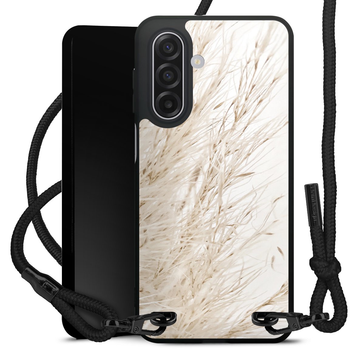 The matt black silicone case is made of flexible TPU (thermoplastic polyurethane) and offers robust protection. The durable, unbreakable material makes the cover flexible and dimensionally stable at the same time. The matte surface makes your design stand out more and is less susceptible to fingerprints and dirt. The stylish trend accessory fits comfortably in the hand and is perfectly complemented by the fabric (polyester) mobile phone strap. The braided fabric strap is approx. 1.70 metres long with a diameter of approx. 0.5 cm. Due to the special knotting technique, the length of the strap can be adjusted by simply pulling it, so that you can adapt it individually to your wishes. The practical case to wear around your neck is available with the fabric strap in black. As a little icing on the cake, we have provided the strap with a chic metal fastener in matt black. The strap is securely fastened to the case with loops made of high-quality genuine leather and press studs. The ends of the fabric strap are covered with metallic end caps and thus protected from fraying.