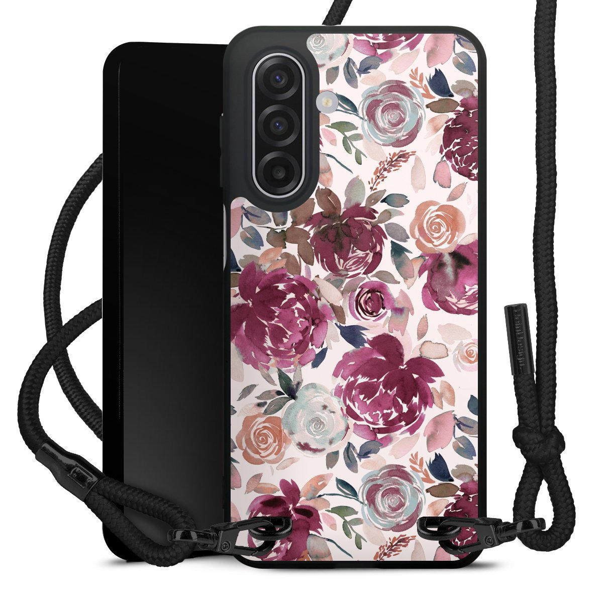 The matt black silicone case is made of flexible TPU (thermoplastic polyurethane) and offers robust protection. The durable, unbreakable material makes the cover flexible and dimensionally stable at the same time. The matte surface makes your design stand out more and is less susceptible to fingerprints and dirt. The stylish trend accessory fits comfortably in the hand and is perfectly complemented by the fabric (polyester) mobile phone strap. The braided fabric strap is approx. 1.70 metres long with a diameter of approx. 0.5 cm. Due to the special knotting technique, the length of the strap can be adjusted by simply pulling it, so that you can adapt it individually to your wishes. The practical case to wear around your neck is available with the fabric strap in black. As a little icing on the cake, we have provided the strap with a chic metal fastener in matt black. The strap is securely fastened to the case with loops made of high-quality genuine leather and press studs. The ends of the fabric strap are covered with metallic end caps and thus protected from fraying.