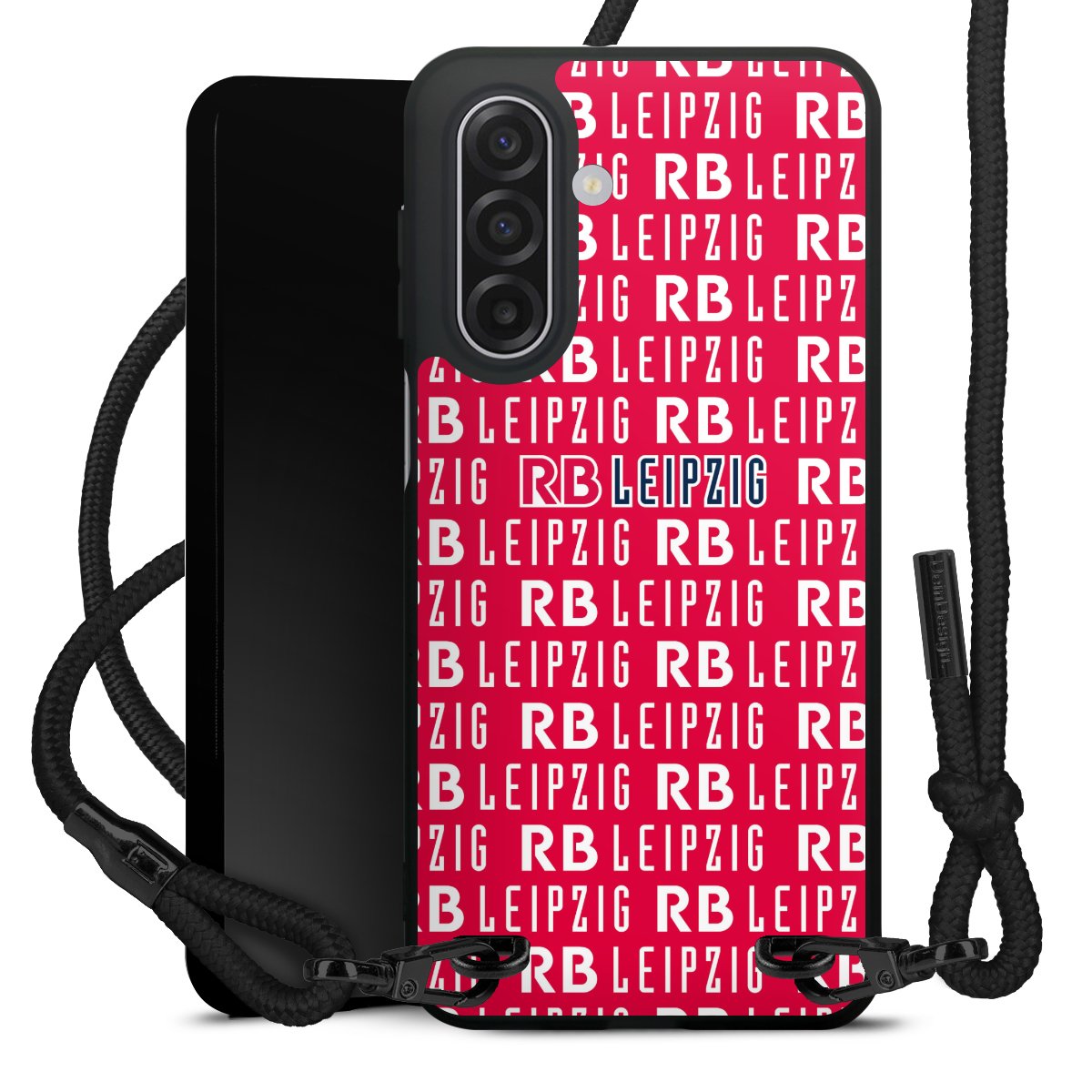 The matt black silicone case is made of flexible TPU (thermoplastic polyurethane) and offers robust protection. The durable, unbreakable material makes the cover flexible and dimensionally stable at the same time. The matte surface makes your design stand out more and is less susceptible to fingerprints and dirt. The stylish trend accessory fits comfortably in the hand and is perfectly complemented by the fabric (polyester) mobile phone strap. The braided fabric strap is approx. 1.70 metres long with a diameter of approx. 0.5 cm. Due to the special knotting technique, the length of the strap can be adjusted by simply pulling it, so that you can adapt it individually to your wishes. The practical case to wear around your neck is available with the fabric strap in black. As a little icing on the cake, we have provided the strap with a chic metal fastener in matt black. The strap is securely fastened to the case with loops made of high-quality genuine leather and press studs. The ends of the fabric strap are covered with metallic end caps and thus protected from fraying.