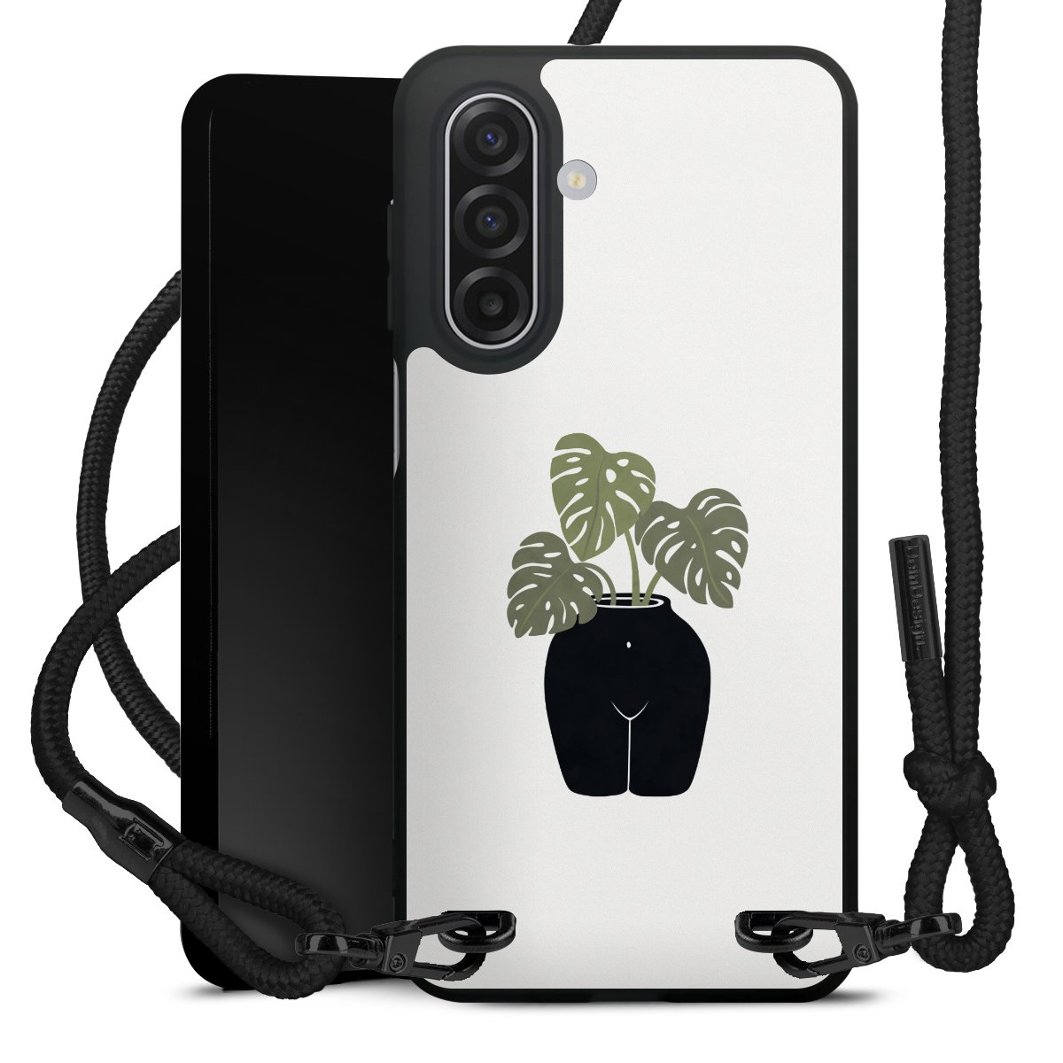 The matt black silicone case is made of flexible TPU (thermoplastic polyurethane) and offers robust protection. The durable, unbreakable material makes the cover flexible and dimensionally stable at the same time. The matte surface makes your design stand out more and is less susceptible to fingerprints and dirt. The stylish trend accessory fits comfortably in the hand and is perfectly complemented by the fabric (polyester) mobile phone strap. The braided fabric strap is approx. 1.70 metres long with a diameter of approx. 0.5 cm. Due to the special knotting technique, the length of the strap can be adjusted by simply pulling it, so that you can adapt it individually to your wishes. The practical case to wear around your neck is available with the fabric strap in black. As a little icing on the cake, we have provided the strap with a chic metal fastener in matt black. The strap is securely fastened to the case with loops made of high-quality genuine leather and press studs. The ends of the fabric strap are covered with metallic end caps and thus protected from fraying.