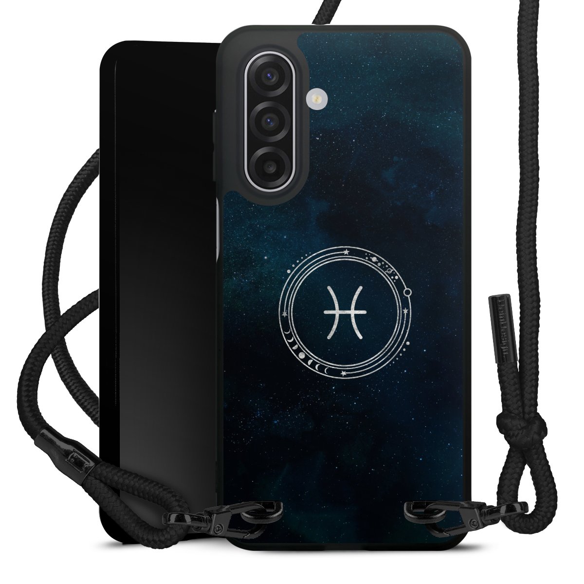 The matt black silicone case is made of flexible TPU (thermoplastic polyurethane) and offers robust protection. The durable, unbreakable material makes the cover flexible and dimensionally stable at the same time. The matte surface makes your design stand out more and is less susceptible to fingerprints and dirt. The stylish trend accessory fits comfortably in the hand and is perfectly complemented by the fabric (polyester) mobile phone strap. The braided fabric strap is approx. 1.70 metres long with a diameter of approx. 0.5 cm. Due to the special knotting technique, the length of the strap can be adjusted by simply pulling it, so that you can adapt it individually to your wishes. The practical case to wear around your neck is available with the fabric strap in black. As a little icing on the cake, we have provided the strap with a chic metal fastener in matt black. The strap is securely fastened to the case with loops made of high-quality genuine leather and press studs. The ends of the fabric strap are covered with metallic end caps and thus protected from fraying.
