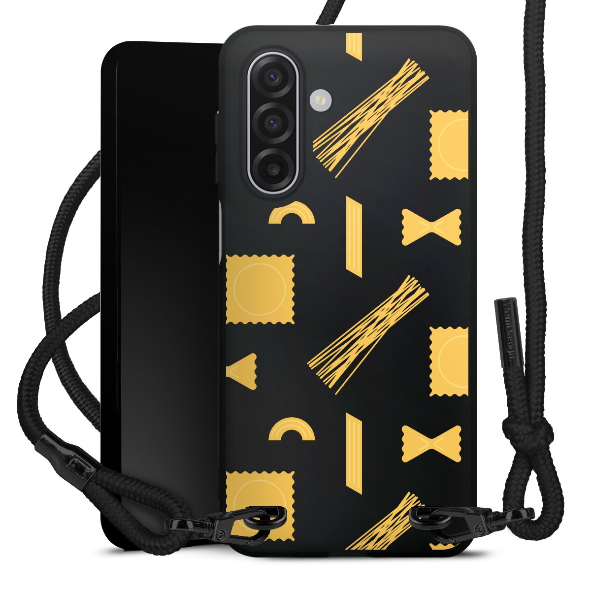 Pure Black: Phone case, fabric strap and metal details in stylish matt black.