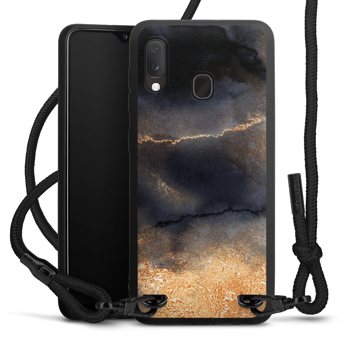 The matt black silicone case is made of flexible TPU (thermoplastic polyurethane) and offers robust protection. The durable, unbreakable material makes the cover flexible and dimensionally stable at the same time. The matte surface makes your design stand out more and is less susceptible to fingerprints and dirt. The stylish trend accessory fits comfortably in the hand and is perfectly complemented by the fabric (polyester) mobile phone strap. The braided fabric strap is approx. 1.70 metres long with a diameter of approx. 0.5 cm. Due to the special knotting technique, the length of the strap can be adjusted by simply pulling it, so that you can adapt it individually to your wishes. The practical case to wear around your neck is available with the fabric strap in black. As a little icing on the cake, we have provided the strap with a chic metal fastener in matt black. The strap is securely fastened to the case with loops made of high-quality genuine leather and press studs. The ends of the fabric strap are covered with metallic end caps and thus protected from fraying.