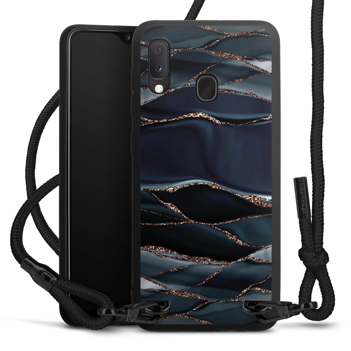 The matt black silicone case is made of flexible TPU (thermoplastic polyurethane) and offers robust protection. The durable, unbreakable material makes the cover flexible and dimensionally stable at the same time. The matte surface makes your design stand out more and is less susceptible to fingerprints and dirt. The stylish trend accessory fits comfortably in the hand and is perfectly complemented by the fabric (polyester) mobile phone strap. The braided fabric strap is approx. 1.70 metres long with a diameter of approx. 0.5 cm. Due to the special knotting technique, the length of the strap can be adjusted by simply pulling it, so that you can adapt it individually to your wishes. The practical case to wear around your neck is available with the fabric strap in black. As a little icing on the cake, we have provided the strap with a chic metal fastener in matt black. The strap is securely fastened to the case with loops made of high-quality genuine leather and press studs. The ends of the fabric strap are covered with metallic end caps and thus protected from fraying.