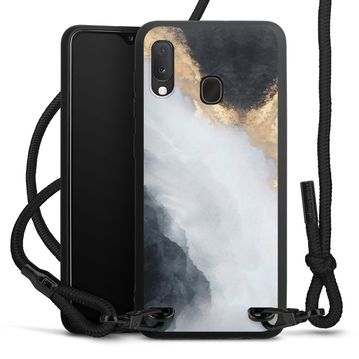 The matt black silicone case is made of flexible TPU (thermoplastic polyurethane) and offers robust protection. The durable, unbreakable material makes the cover flexible and dimensionally stable at the same time. The matte surface makes your design stand out more and is less susceptible to fingerprints and dirt. The stylish trend accessory fits comfortably in the hand and is perfectly complemented by the fabric (polyester) mobile phone strap. The braided fabric strap is approx. 1.70 metres long with a diameter of approx. 0.5 cm. Due to the special knotting technique, the length of the strap can be adjusted by simply pulling it, so that you can adapt it individually to your wishes. The practical case to wear around your neck is available with the fabric strap in black. As a little icing on the cake, we have provided the strap with a chic metal fastener in matt black. The strap is securely fastened to the case with loops made of high-quality genuine leather and press studs. The ends of the fabric strap are covered with metallic end caps and thus protected from fraying.