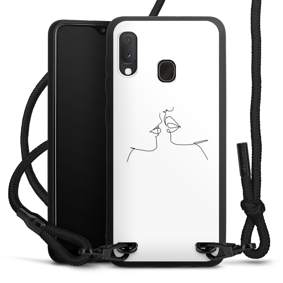 The matt black silicone case is made of flexible TPU (thermoplastic polyurethane) and offers robust protection. The durable, unbreakable material makes the cover flexible and dimensionally stable at the same time. The matte surface makes your design stand out more and is less susceptible to fingerprints and dirt. The stylish trend accessory fits comfortably in the hand and is perfectly complemented by the fabric (polyester) mobile phone strap. The braided fabric strap is approx. 1.70 metres long with a diameter of approx. 0.5 cm. Due to the special knotting technique, the length of the strap can be adjusted by simply pulling it, so that you can adapt it individually to your wishes. The practical case to wear around your neck is available with the fabric strap in black. As a little icing on the cake, we have provided the strap with a chic metal fastener in matt black. The strap is securely fastened to the case with loops made of high-quality genuine leather and press studs. The ends of the fabric strap are covered with metallic end caps and thus protected from fraying.