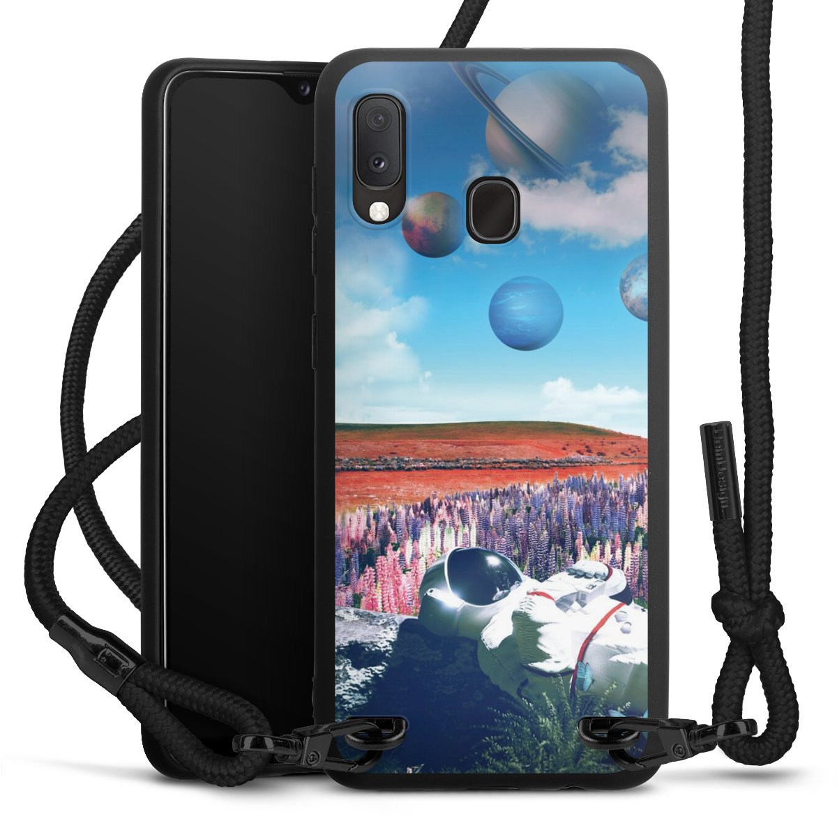 We use the solid direct print process for this phone case, which is why the print area only covers the back and the edge remains unprinted. The case to wear around your neck can be ordered unprinted, fully printed, or partially printed. For your design, either choose one of our exclusive shop motifs or get creative and create your own design, for example with photos and overlays. Design your own personal trend accessory and make an individual statement on the streets!