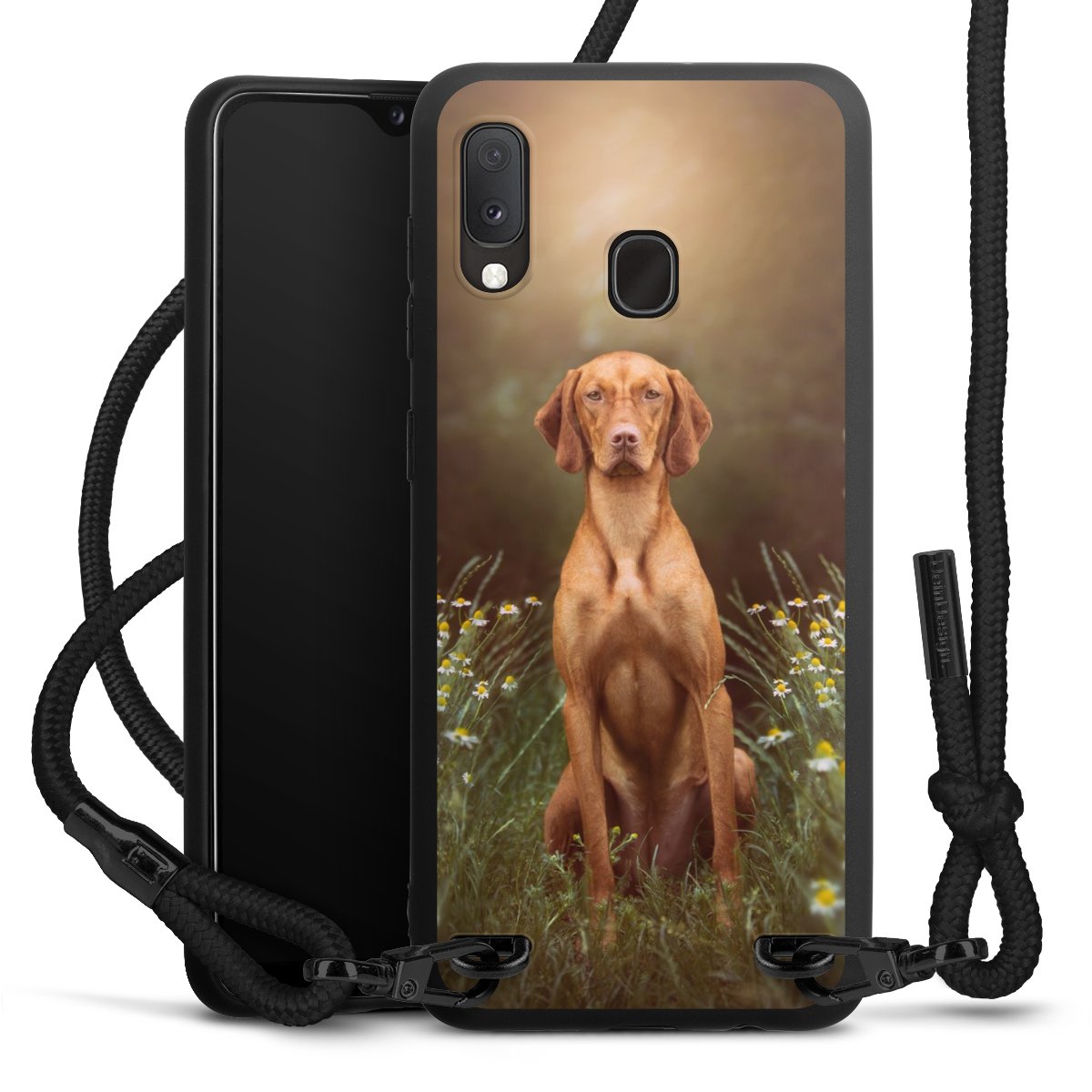 The matt black silicone case is made of flexible TPU (thermoplastic polyurethane) and offers robust protection. The durable, unbreakable material makes the cover flexible and dimensionally stable at the same time. The matte surface makes your design stand out more and is less susceptible to fingerprints and dirt. The stylish trend accessory fits comfortably in the hand and is perfectly complemented by the fabric (polyester) mobile phone strap. The braided fabric strap is approx. 1.70 metres long with a diameter of approx. 0.5 cm. Due to the special knotting technique, the length of the strap can be adjusted by simply pulling it, so that you can adapt it individually to your wishes. The practical case to wear around your neck is available with the fabric strap in black. As a little icing on the cake, we have provided the strap with a chic metal fastener in matt black. The strap is securely fastened to the case with loops made of high-quality genuine leather and press studs. The ends of the fabric strap are covered with metallic end caps and thus protected from fraying.