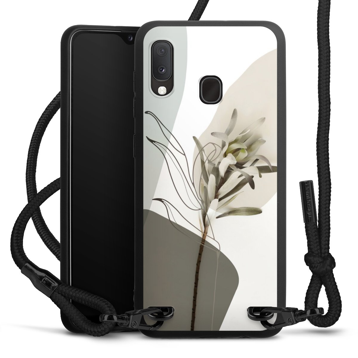 The matt black silicone case is made of flexible TPU (thermoplastic polyurethane) and offers robust protection. The durable, unbreakable material makes the cover flexible and dimensionally stable at the same time. The matte surface makes your design stand out more and is less susceptible to fingerprints and dirt. The stylish trend accessory fits comfortably in the hand and is perfectly complemented by the fabric (polyester) mobile phone strap. The braided fabric strap is approx. 1.70 metres long with a diameter of approx. 0.5 cm. Due to the special knotting technique, the length of the strap can be adjusted by simply pulling it, so that you can adapt it individually to your wishes. The practical case to wear around your neck is available with the fabric strap in black. As a little icing on the cake, we have provided the strap with a chic metal fastener in matt black. The strap is securely fastened to the case with loops made of high-quality genuine leather and press studs. The ends of the fabric strap are covered with metallic end caps and thus protected from fraying.