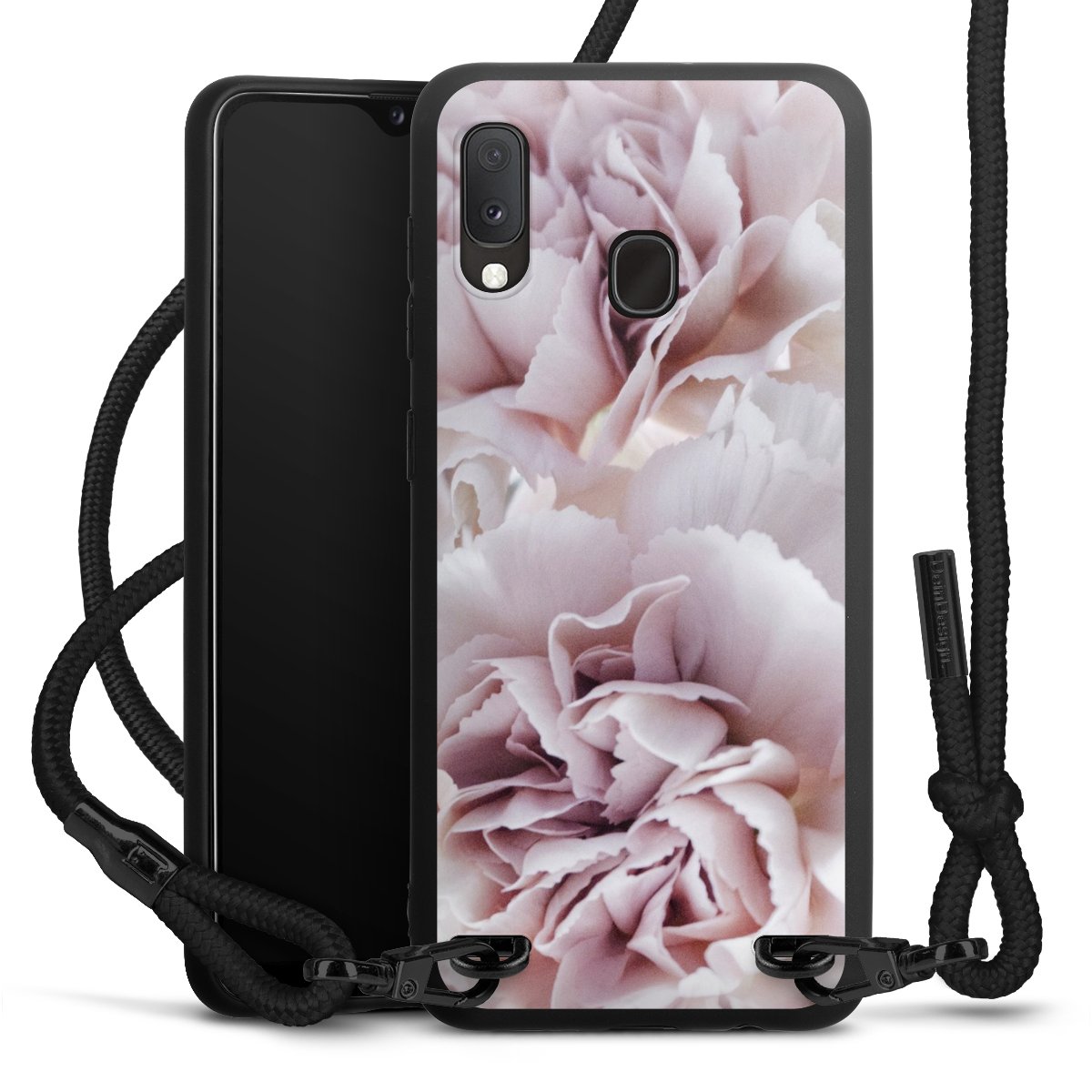 The matt black silicone case is made of flexible TPU (thermoplastic polyurethane) and offers robust protection. The durable, unbreakable material makes the cover flexible and dimensionally stable at the same time. The matte surface makes your design stand out more and is less susceptible to fingerprints and dirt. The stylish trend accessory fits comfortably in the hand and is perfectly complemented by the fabric (polyester) mobile phone strap. The braided fabric strap is approx. 1.70 metres long with a diameter of approx. 0.5 cm. Due to the special knotting technique, the length of the strap can be adjusted by simply pulling it, so that you can adapt it individually to your wishes. The practical case to wear around your neck is available with the fabric strap in black. As a little icing on the cake, we have provided the strap with a chic metal fastener in matt black. The strap is securely fastened to the case with loops made of high-quality genuine leather and press studs. The ends of the fabric strap are covered with metallic end caps and thus protected from fraying.