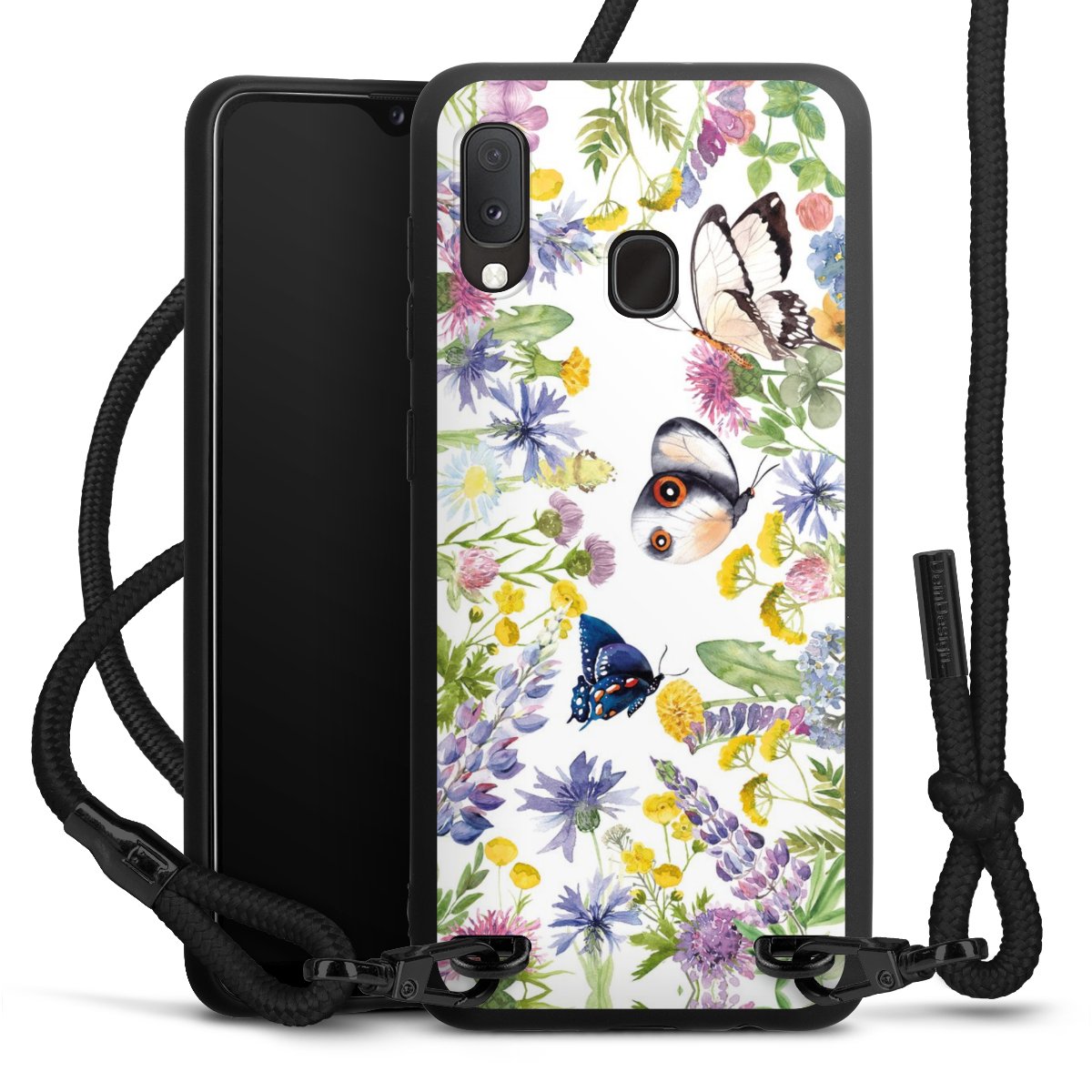 The matt black silicone case is made of flexible TPU (thermoplastic polyurethane) and offers robust protection. The durable, unbreakable material makes the cover flexible and dimensionally stable at the same time. The matte surface makes your design stand out more and is less susceptible to fingerprints and dirt. The stylish trend accessory fits comfortably in the hand and is perfectly complemented by the fabric (polyester) mobile phone strap. The braided fabric strap is approx. 1.70 metres long with a diameter of approx. 0.5 cm. Due to the special knotting technique, the length of the strap can be adjusted by simply pulling it, so that you can adapt it individually to your wishes. The practical case to wear around your neck is available with the fabric strap in black. As a little icing on the cake, we have provided the strap with a chic metal fastener in matt black. The strap is securely fastened to the case with loops made of high-quality genuine leather and press studs. The ends of the fabric strap are covered with metallic end caps and thus protected from fraying.