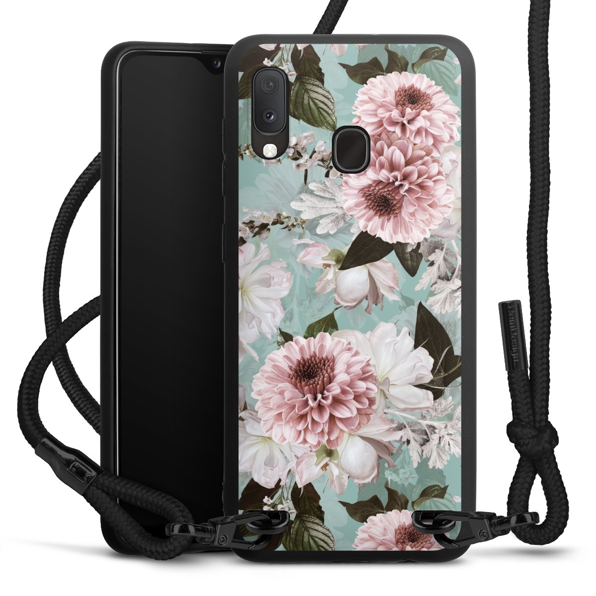 The matt black silicone case is made of flexible TPU (thermoplastic polyurethane) and offers robust protection. The durable, unbreakable material makes the cover flexible and dimensionally stable at the same time. The matte surface makes your design stand out more and is less susceptible to fingerprints and dirt. The stylish trend accessory fits comfortably in the hand and is perfectly complemented by the fabric (polyester) mobile phone strap. The braided fabric strap is approx. 1.70 metres long with a diameter of approx. 0.5 cm. Due to the special knotting technique, the length of the strap can be adjusted by simply pulling it, so that you can adapt it individually to your wishes. The practical case to wear around your neck is available with the fabric strap in black. As a little icing on the cake, we have provided the strap with a chic metal fastener in matt black. The strap is securely fastened to the case with loops made of high-quality genuine leather and press studs. The ends of the fabric strap are covered with metallic end caps and thus protected from fraying.