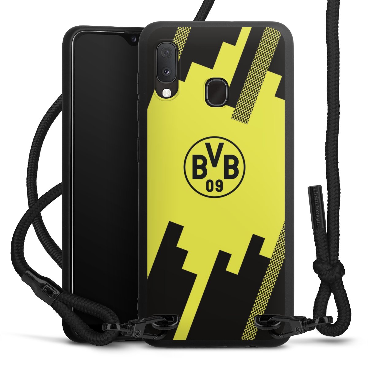 The matt black silicone case is made of flexible TPU (thermoplastic polyurethane) and offers robust protection. The durable, unbreakable material makes the cover flexible and dimensionally stable at the same time. The matte surface makes your design stand out more and is less susceptible to fingerprints and dirt. The stylish trend accessory fits comfortably in the hand and is perfectly complemented by the fabric (polyester) mobile phone strap. The braided fabric strap is approx. 1.70 metres long with a diameter of approx. 0.5 cm. Due to the special knotting technique, the length of the strap can be adjusted by simply pulling it, so that you can adapt it individually to your wishes. The practical case to wear around your neck is available with the fabric strap in black. As a little icing on the cake, we have provided the strap with a chic metal fastener in matt black. The strap is securely fastened to the case with loops made of high-quality genuine leather and press studs. The ends of the fabric strap are covered with metallic end caps and thus protected from fraying.