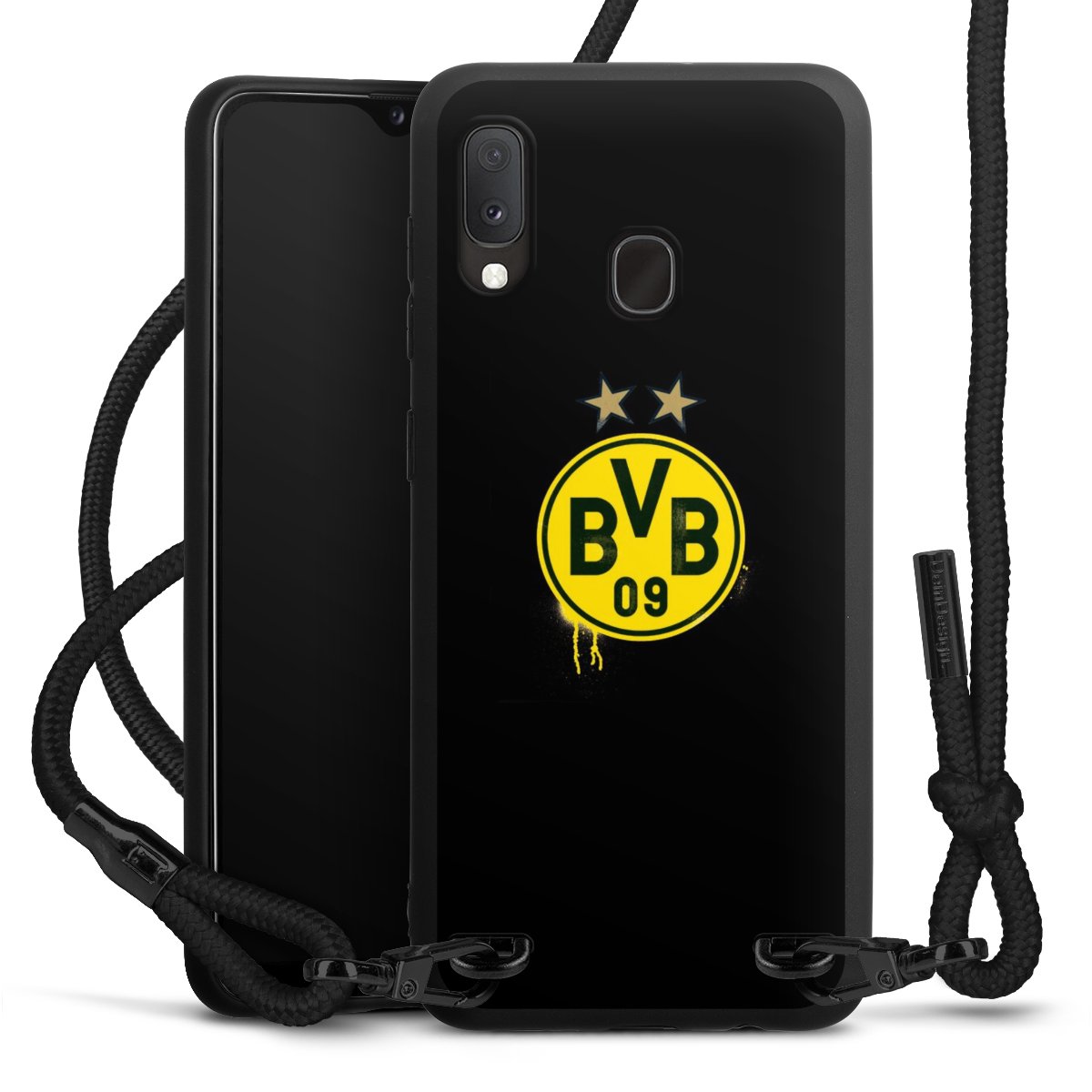 The matt black silicone case is made of flexible TPU (thermoplastic polyurethane) and offers robust protection. The durable, unbreakable material makes the cover flexible and dimensionally stable at the same time. The matte surface makes your design stand out more and is less susceptible to fingerprints and dirt. The stylish trend accessory fits comfortably in the hand and is perfectly complemented by the fabric (polyester) mobile phone strap. The braided fabric strap is approx. 1.70 metres long with a diameter of approx. 0.5 cm. Due to the special knotting technique, the length of the strap can be adjusted by simply pulling it, so that you can adapt it individually to your wishes. The practical case to wear around your neck is available with the fabric strap in black. As a little icing on the cake, we have provided the strap with a chic metal fastener in matt black. The strap is securely fastened to the case with loops made of high-quality genuine leather and press studs. The ends of the fabric strap are covered with metallic end caps and thus protected from fraying.