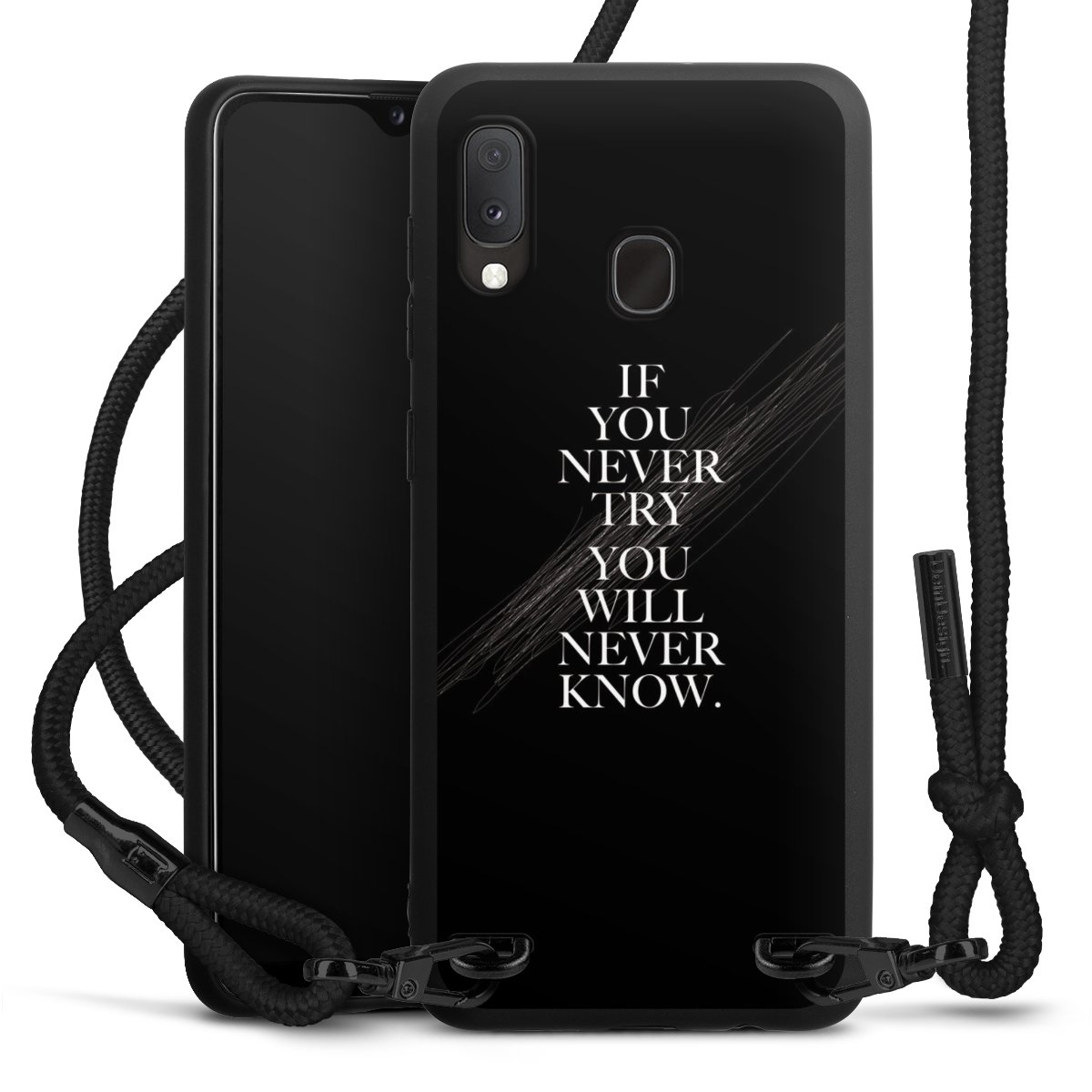 The matt black silicone case is made of flexible TPU (thermoplastic polyurethane) and offers robust protection. The durable, unbreakable material makes the cover flexible and dimensionally stable at the same time. The matte surface makes your design stand out more and is less susceptible to fingerprints and dirt. The stylish trend accessory fits comfortably in the hand and is perfectly complemented by the fabric (polyester) mobile phone strap. The braided fabric strap is approx. 1.70 metres long with a diameter of approx. 0.5 cm. Due to the special knotting technique, the length of the strap can be adjusted by simply pulling it, so that you can adapt it individually to your wishes. The practical case to wear around your neck is available with the fabric strap in black. As a little icing on the cake, we have provided the strap with a chic metal fastener in matt black. The strap is securely fastened to the case with loops made of high-quality genuine leather and press studs. The ends of the fabric strap are covered with metallic end caps and thus protected from fraying.