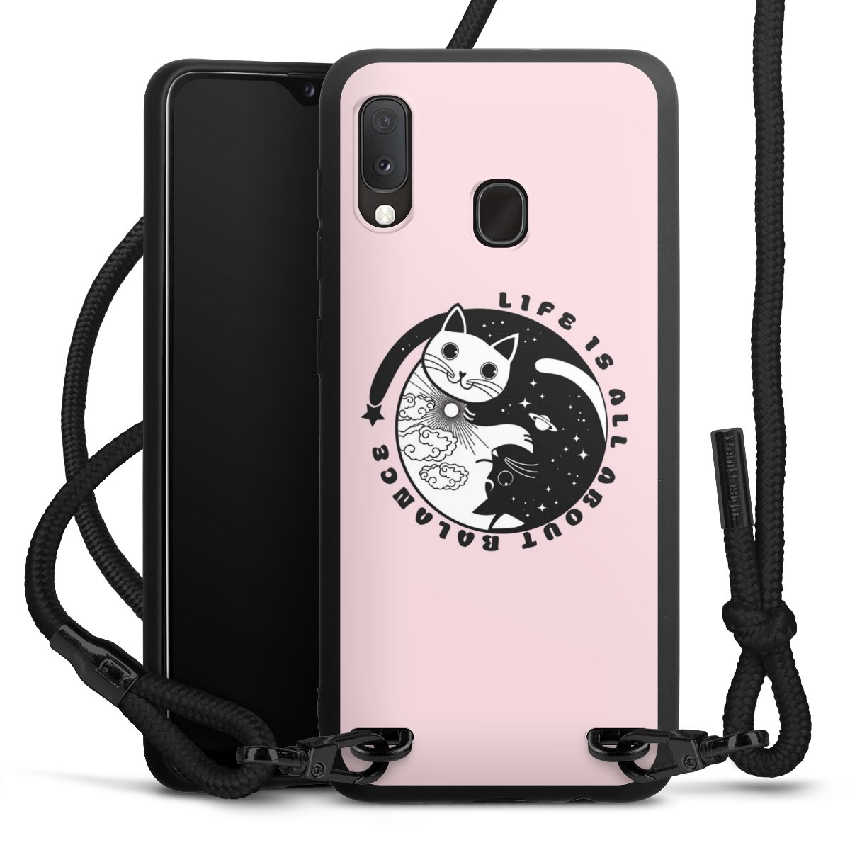 The matt black silicone case is made of flexible TPU (thermoplastic polyurethane) and offers robust protection. The durable, unbreakable material makes the cover flexible and dimensionally stable at the same time. The matte surface makes your design stand out more and is less susceptible to fingerprints and dirt. The stylish trend accessory fits comfortably in the hand and is perfectly complemented by the fabric (polyester) mobile phone strap. The braided fabric strap is approx. 1.70 metres long with a diameter of approx. 0.5 cm. Due to the special knotting technique, the length of the strap can be adjusted by simply pulling it, so that you can adapt it individually to your wishes. The practical case to wear around your neck is available with the fabric strap in black. As a little icing on the cake, we have provided the strap with a chic metal fastener in matt black. The strap is securely fastened to the case with loops made of high-quality genuine leather and press studs. The ends of the fabric strap are covered with metallic end caps and thus protected from fraying.