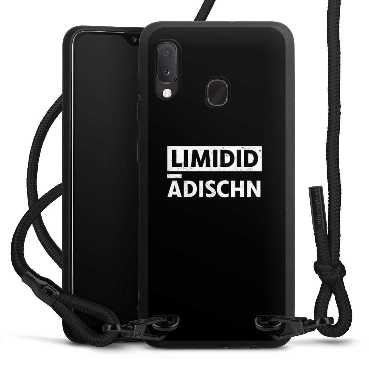 The matt black silicone case is made of flexible TPU (thermoplastic polyurethane) and offers robust protection. The durable, unbreakable material makes the cover flexible and dimensionally stable at the same time. The matte surface makes your design stand out more and is less susceptible to fingerprints and dirt. The stylish trend accessory fits comfortably in the hand and is perfectly complemented by the fabric (polyester) mobile phone strap. The braided fabric strap is approx. 1.70 metres long with a diameter of approx. 0.5 cm. Due to the special knotting technique, the length of the strap can be adjusted by simply pulling it, so that you can adapt it individually to your wishes. The practical case to wear around your neck is available with the fabric strap in black. As a little icing on the cake, we have provided the strap with a chic metal fastener in matt black. The strap is securely fastened to the case with loops made of high-quality genuine leather and press studs. The ends of the fabric strap are covered with metallic end caps and thus protected from fraying.