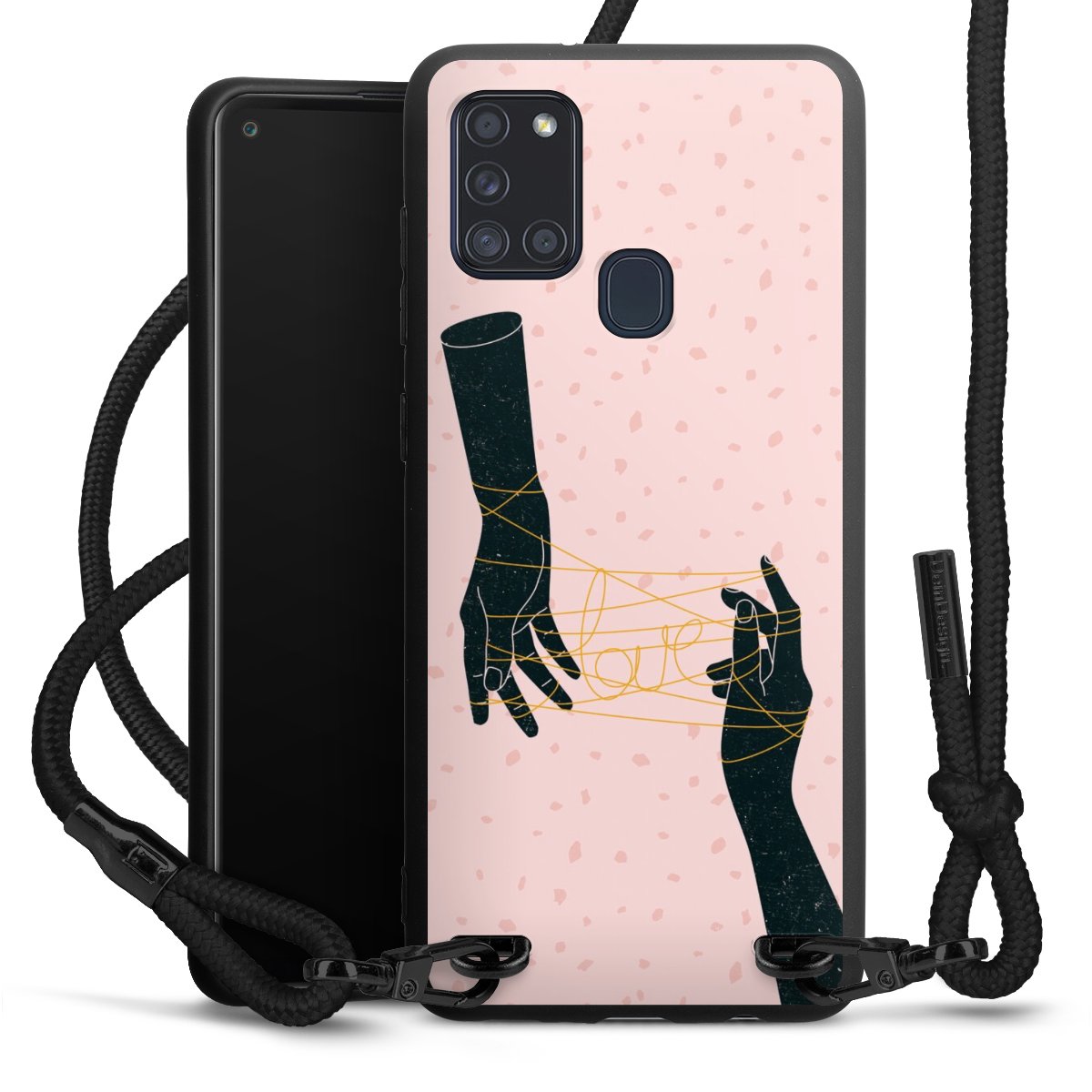 The matt black silicone case is made of flexible TPU (thermoplastic polyurethane) and offers robust protection. The durable, unbreakable material makes the cover flexible and dimensionally stable at the same time. The matte surface makes your design stand out more and is less susceptible to fingerprints and dirt. The stylish trend accessory fits comfortably in the hand and is perfectly complemented by the fabric (polyester) mobile phone strap. The braided fabric strap is approx. 1.70 metres long with a diameter of approx. 0.5 cm. Due to the special knotting technique, the length of the strap can be adjusted by simply pulling it, so that you can adapt it individually to your wishes. The practical case to wear around your neck is available with the fabric strap in black. As a little icing on the cake, we have provided the strap with a chic metal fastener in matt black. The strap is securely fastened to the case with loops made of high-quality genuine leather and press studs. The ends of the fabric strap are covered with metallic end caps and thus protected from fraying.