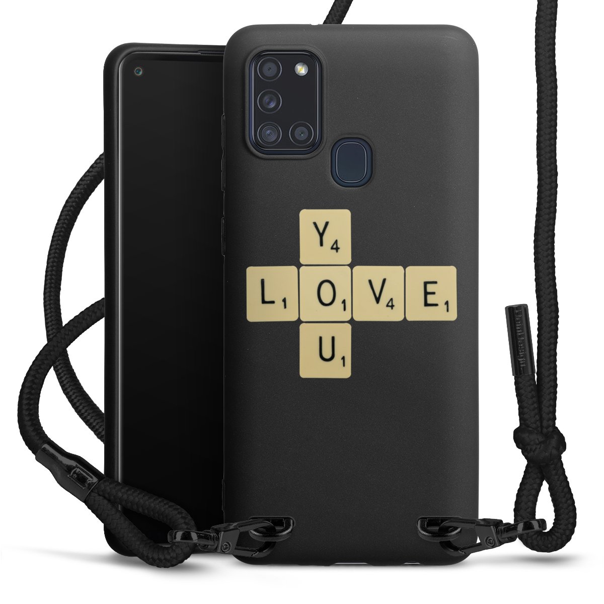 The matt black silicone case is made of flexible TPU (thermoplastic polyurethane) and offers robust protection. The durable, unbreakable material makes the cover flexible and dimensionally stable at the same time. The matte surface makes your design stand out more and is less susceptible to fingerprints and dirt. The stylish trend accessory fits comfortably in the hand and is perfectly complemented by the fabric (polyester) mobile phone strap. The braided fabric strap is approx. 1.70 metres long with a diameter of approx. 0.5 cm. Due to the special knotting technique, the length of the strap can be adjusted by simply pulling it, so that you can adapt it individually to your wishes. The practical case to wear around your neck is available with the fabric strap in black. As a little icing on the cake, we have provided the strap with a chic metal fastener in matt black. The strap is securely fastened to the case with loops made of high-quality genuine leather and press studs. The ends of the fabric strap are covered with metallic end caps and thus protected from fraying.