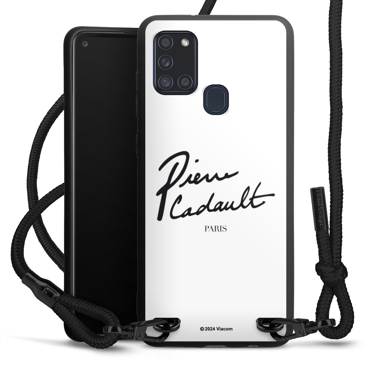 The matt black silicone case is made of flexible TPU (thermoplastic polyurethane) and offers robust protection. The durable, unbreakable material makes the cover flexible and dimensionally stable at the same time. The matte surface makes your design stand out more and is less susceptible to fingerprints and dirt. The stylish trend accessory fits comfortably in the hand and is perfectly complemented by the fabric (polyester) mobile phone strap. The braided fabric strap is approx. 1.70 metres long with a diameter of approx. 0.5 cm. Due to the special knotting technique, the length of the strap can be adjusted by simply pulling it, so that you can adapt it individually to your wishes. The practical case to wear around your neck is available with the fabric strap in black. As a little icing on the cake, we have provided the strap with a chic metal fastener in matt black. The strap is securely fastened to the case with loops made of high-quality genuine leather and press studs. The ends of the fabric strap are covered with metallic end caps and thus protected from fraying.