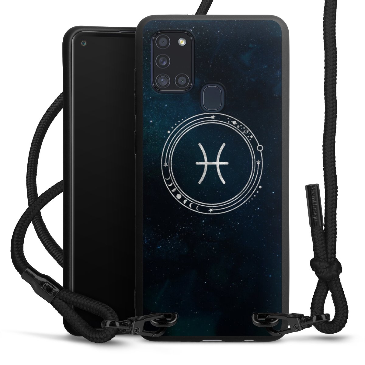 The matt black silicone case is made of flexible TPU (thermoplastic polyurethane) and offers robust protection. The durable, unbreakable material makes the cover flexible and dimensionally stable at the same time. The matte surface makes your design stand out more and is less susceptible to fingerprints and dirt. The stylish trend accessory fits comfortably in the hand and is perfectly complemented by the fabric (polyester) mobile phone strap. The braided fabric strap is approx. 1.70 metres long with a diameter of approx. 0.5 cm. Due to the special knotting technique, the length of the strap can be adjusted by simply pulling it, so that you can adapt it individually to your wishes. The practical case to wear around your neck is available with the fabric strap in black. As a little icing on the cake, we have provided the strap with a chic metal fastener in matt black. The strap is securely fastened to the case with loops made of high-quality genuine leather and press studs. The ends of the fabric strap are covered with metallic end caps and thus protected from fraying.