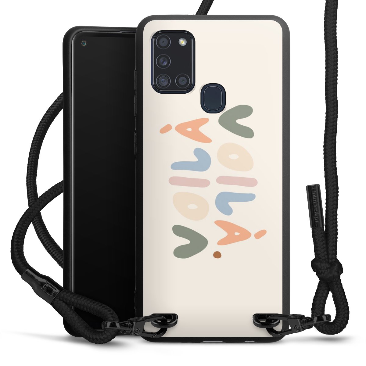 The matt black silicone case is made of flexible TPU (thermoplastic polyurethane) and offers robust protection. The durable, unbreakable material makes the cover flexible and dimensionally stable at the same time. The matte surface makes your design stand out more and is less susceptible to fingerprints and dirt. The stylish trend accessory fits comfortably in the hand and is perfectly complemented by the fabric (polyester) mobile phone strap. The braided fabric strap is approx. 1.70 metres long with a diameter of approx. 0.5 cm. Due to the special knotting technique, the length of the strap can be adjusted by simply pulling it, so that you can adapt it individually to your wishes. The practical case to wear around your neck is available with the fabric strap in black. As a little icing on the cake, we have provided the strap with a chic metal fastener in matt black. The strap is securely fastened to the case with loops made of high-quality genuine leather and press studs. The ends of the fabric strap are covered with metallic end caps and thus protected from fraying.
