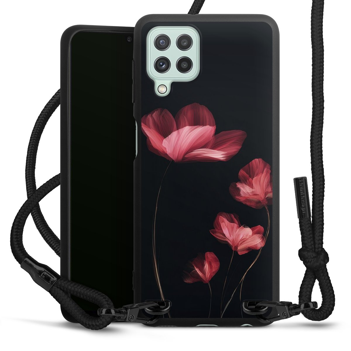 The matt black silicone case is made of flexible TPU (thermoplastic polyurethane) and offers robust protection. The durable, unbreakable material makes the cover flexible and dimensionally stable at the same time. The matte surface makes your design stand out more and is less susceptible to fingerprints and dirt. The stylish trend accessory fits comfortably in the hand and is perfectly complemented by the fabric (polyester) mobile phone strap. The braided fabric strap is approx. 1.70 metres long with a diameter of approx. 0.5 cm. Due to the special knotting technique, the length of the strap can be adjusted by simply pulling it, so that you can adapt it individually to your wishes. The practical case to wear around your neck is available with the fabric strap in black. As a little icing on the cake, we have provided the strap with a chic metal fastener in matt black. The strap is securely fastened to the case with loops made of high-quality genuine leather and press studs. The ends of the fabric strap are covered with metallic end caps and thus protected from fraying.