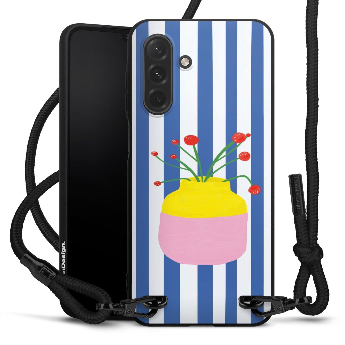 The matt black silicone case is made of flexible TPU (thermoplastic polyurethane) and offers robust protection. The durable, unbreakable material makes the cover flexible and dimensionally stable at the same time. The matte surface makes your design stand out more and is less susceptible to fingerprints and dirt. The stylish trend accessory fits comfortably in the hand and is perfectly complemented by the fabric (polyester) mobile phone strap. The braided fabric strap is approx. 1.70 metres long with a diameter of approx. 0.5 cm. Due to the special knotting technique, the length of the strap can be adjusted by simply pulling it, so that you can adapt it individually to your wishes. The practical case to wear around your neck is available with the fabric strap in black. As a little icing on the cake, we have provided the strap with a chic metal fastener in matt black. The strap is securely fastened to the case with loops made of high-quality genuine leather and press studs. The ends of the fabric strap are covered with metallic end caps and thus protected from fraying.