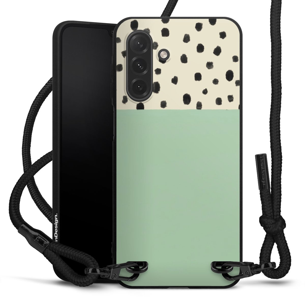 The matt black silicone case is made of flexible TPU (thermoplastic polyurethane) and offers robust protection. The durable, unbreakable material makes the cover flexible and dimensionally stable at the same time. The matte surface makes your design stand out more and is less susceptible to fingerprints and dirt. The stylish trend accessory fits comfortably in the hand and is perfectly complemented by the fabric (polyester) mobile phone strap. The braided fabric strap is approx. 1.70 metres long with a diameter of approx. 0.5 cm. Due to the special knotting technique, the length of the strap can be adjusted by simply pulling it, so that you can adapt it individually to your wishes. The practical case to wear around your neck is available with the fabric strap in black. As a little icing on the cake, we have provided the strap with a chic metal fastener in matt black. The strap is securely fastened to the case with loops made of high-quality genuine leather and press studs. The ends of the fabric strap are covered with metallic end caps and thus protected from fraying.
