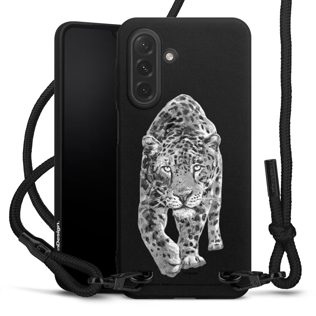 The matt black silicone case is made of flexible TPU (thermoplastic polyurethane) and offers robust protection. The durable, unbreakable material makes the cover flexible and dimensionally stable at the same time. The matte surface makes your design stand out more and is less susceptible to fingerprints and dirt. The stylish trend accessory fits comfortably in the hand and is perfectly complemented by the fabric (polyester) mobile phone strap. The braided fabric strap is approx. 1.70 metres long with a diameter of approx. 0.5 cm. Due to the special knotting technique, the length of the strap can be adjusted by simply pulling it, so that you can adapt it individually to your wishes. The practical case to wear around your neck is available with the fabric strap in black. As a little icing on the cake, we have provided the strap with a chic metal fastener in matt black. The strap is securely fastened to the case with loops made of high-quality genuine leather and press studs. The ends of the fabric strap are covered with metallic end caps and thus protected from fraying.