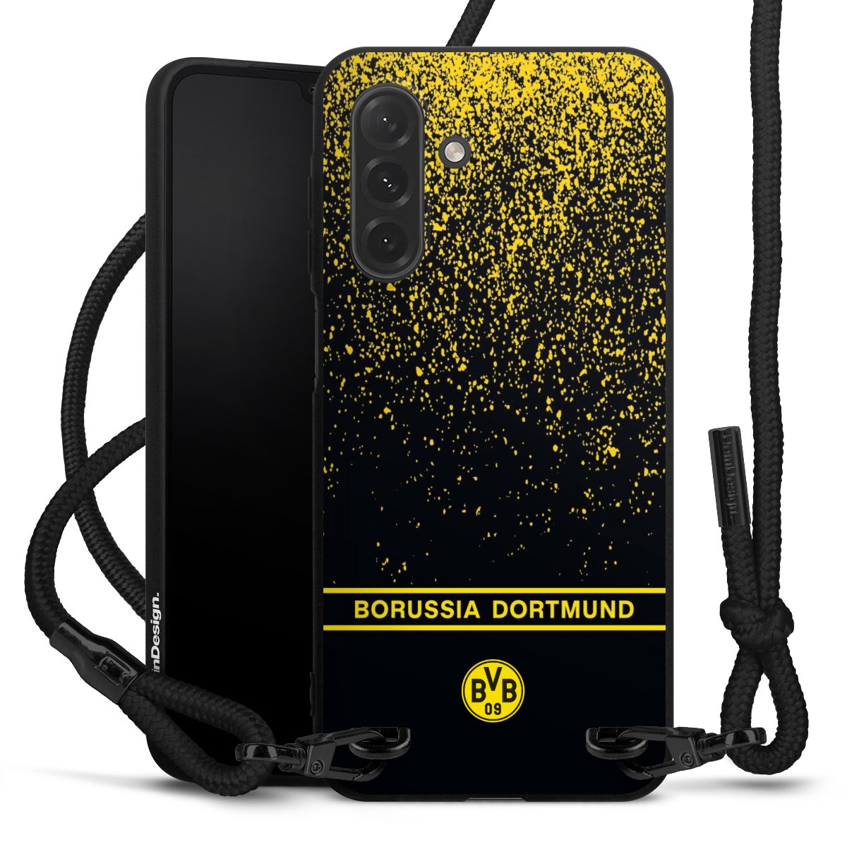 The matt black silicone case is made of flexible TPU (thermoplastic polyurethane) and offers robust protection. The durable, unbreakable material makes the cover flexible and dimensionally stable at the same time. The matte surface makes your design stand out more and is less susceptible to fingerprints and dirt. The stylish trend accessory fits comfortably in the hand and is perfectly complemented by the fabric (polyester) mobile phone strap. The braided fabric strap is approx. 1.70 metres long with a diameter of approx. 0.5 cm. Due to the special knotting technique, the length of the strap can be adjusted by simply pulling it, so that you can adapt it individually to your wishes. The practical case to wear around your neck is available with the fabric strap in black. As a little icing on the cake, we have provided the strap with a chic metal fastener in matt black. The strap is securely fastened to the case with loops made of high-quality genuine leather and press studs. The ends of the fabric strap are covered with metallic end caps and thus protected from fraying.