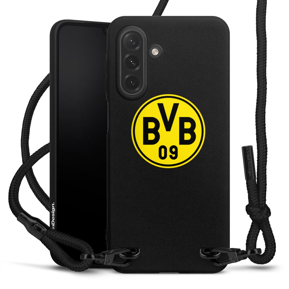 The matt black silicone case is made of flexible TPU (thermoplastic polyurethane) and offers robust protection. The durable, unbreakable material makes the cover flexible and dimensionally stable at the same time. The matte surface makes your design stand out more and is less susceptible to fingerprints and dirt. The stylish trend accessory fits comfortably in the hand and is perfectly complemented by the fabric (polyester) mobile phone strap. The braided fabric strap is approx. 1.70 metres long with a diameter of approx. 0.5 cm. Due to the special knotting technique, the length of the strap can be adjusted by simply pulling it, so that you can adapt it individually to your wishes. The practical case to wear around your neck is available with the fabric strap in black. As a little icing on the cake, we have provided the strap with a chic metal fastener in matt black. The strap is securely fastened to the case with loops made of high-quality genuine leather and press studs. The ends of the fabric strap are covered with metallic end caps and thus protected from fraying.