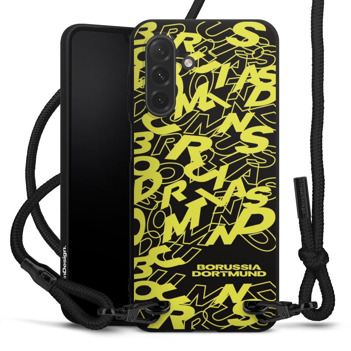 The matt black silicone case is made of flexible TPU (thermoplastic polyurethane) and offers robust protection. The durable, unbreakable material makes the cover flexible and dimensionally stable at the same time. The matte surface makes your design stand out more and is less susceptible to fingerprints and dirt. The stylish trend accessory fits comfortably in the hand and is perfectly complemented by the fabric (polyester) mobile phone strap. The braided fabric strap is approx. 1.70 metres long with a diameter of approx. 0.5 cm. Due to the special knotting technique, the length of the strap can be adjusted by simply pulling it, so that you can adapt it individually to your wishes. The practical case to wear around your neck is available with the fabric strap in black. As a little icing on the cake, we have provided the strap with a chic metal fastener in matt black. The strap is securely fastened to the case with loops made of high-quality genuine leather and press studs. The ends of the fabric strap are covered with metallic end caps and thus protected from fraying.