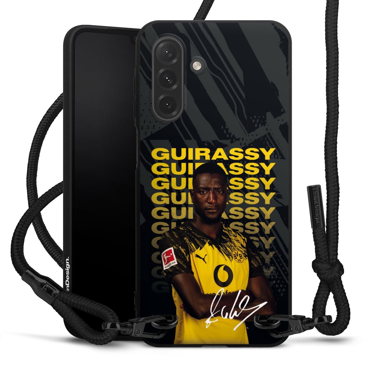 The matt black silicone case is made of flexible TPU (thermoplastic polyurethane) and offers robust protection. The durable, unbreakable material makes the cover flexible and dimensionally stable at the same time. The matte surface makes your design stand out more and is less susceptible to fingerprints and dirt. The stylish trend accessory fits comfortably in the hand and is perfectly complemented by the fabric (polyester) mobile phone strap. The braided fabric strap is approx. 1.70 metres long with a diameter of approx. 0.5 cm. Due to the special knotting technique, the length of the strap can be adjusted by simply pulling it, so that you can adapt it individually to your wishes. The practical case to wear around your neck is available with the fabric strap in black. As a little icing on the cake, we have provided the strap with a chic metal fastener in matt black. The strap is securely fastened to the case with loops made of high-quality genuine leather and press studs. The ends of the fabric strap are covered with metallic end caps and thus protected from fraying.