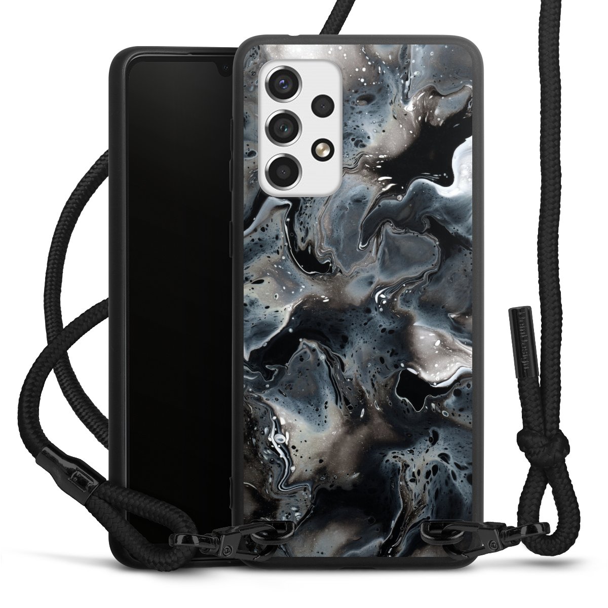 The matt black silicone case is made of flexible TPU (thermoplastic polyurethane) and offers robust protection. The durable, unbreakable material makes the cover flexible and dimensionally stable at the same time. The matte surface makes your design stand out more and is less susceptible to fingerprints and dirt. The stylish trend accessory fits comfortably in the hand and is perfectly complemented by the fabric (polyester) mobile phone strap. The braided fabric strap is approx. 1.70 metres long with a diameter of approx. 0.5 cm. Due to the special knotting technique, the length of the strap can be adjusted by simply pulling it, so that you can adapt it individually to your wishes. The practical case to wear around your neck is available with the fabric strap in black. As a little icing on the cake, we have provided the strap with a chic metal fastener in matt black. The strap is securely fastened to the case with loops made of high-quality genuine leather and press studs. The ends of the fabric strap are covered with metallic end caps and thus protected from fraying.