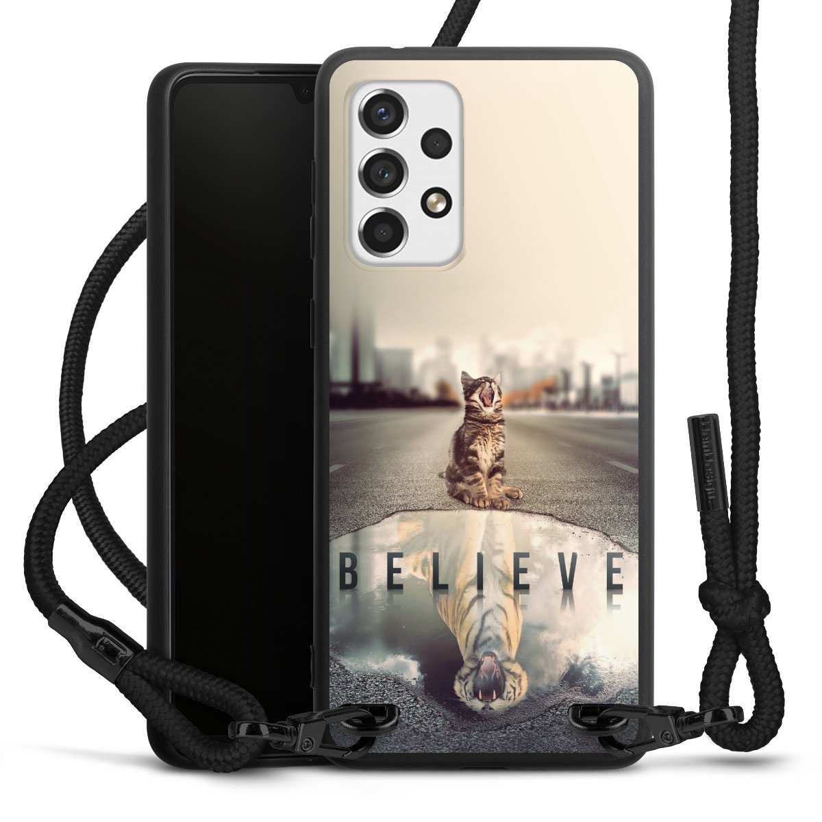 We use the solid direct print process for this phone case, which is why the print area only covers the back and the edge remains unprinted. The case to wear around your neck can be ordered unprinted, fully printed, or partially printed. For your design, either choose one of our exclusive shop motifs or get creative and create your own design, for example with photos and overlays. Design your own personal trend accessory and make an individual statement on the streets!