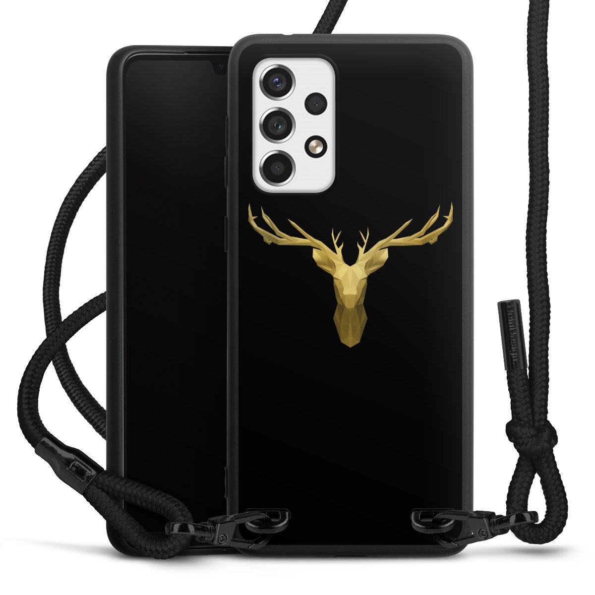 The matt black silicone case is made of flexible TPU (thermoplastic polyurethane) and offers robust protection. The durable, unbreakable material makes the cover flexible and dimensionally stable at the same time. The matte surface makes your design stand out more and is less susceptible to fingerprints and dirt. The stylish trend accessory fits comfortably in the hand and is perfectly complemented by the fabric (polyester) mobile phone strap. The braided fabric strap is approx. 1.70 metres long with a diameter of approx. 0.5 cm. Due to the special knotting technique, the length of the strap can be adjusted by simply pulling it, so that you can adapt it individually to your wishes. The practical case to wear around your neck is available with the fabric strap in black. As a little icing on the cake, we have provided the strap with a chic metal fastener in matt black. The strap is securely fastened to the case with loops made of high-quality genuine leather and press studs. The ends of the fabric strap are covered with metallic end caps and thus protected from fraying.