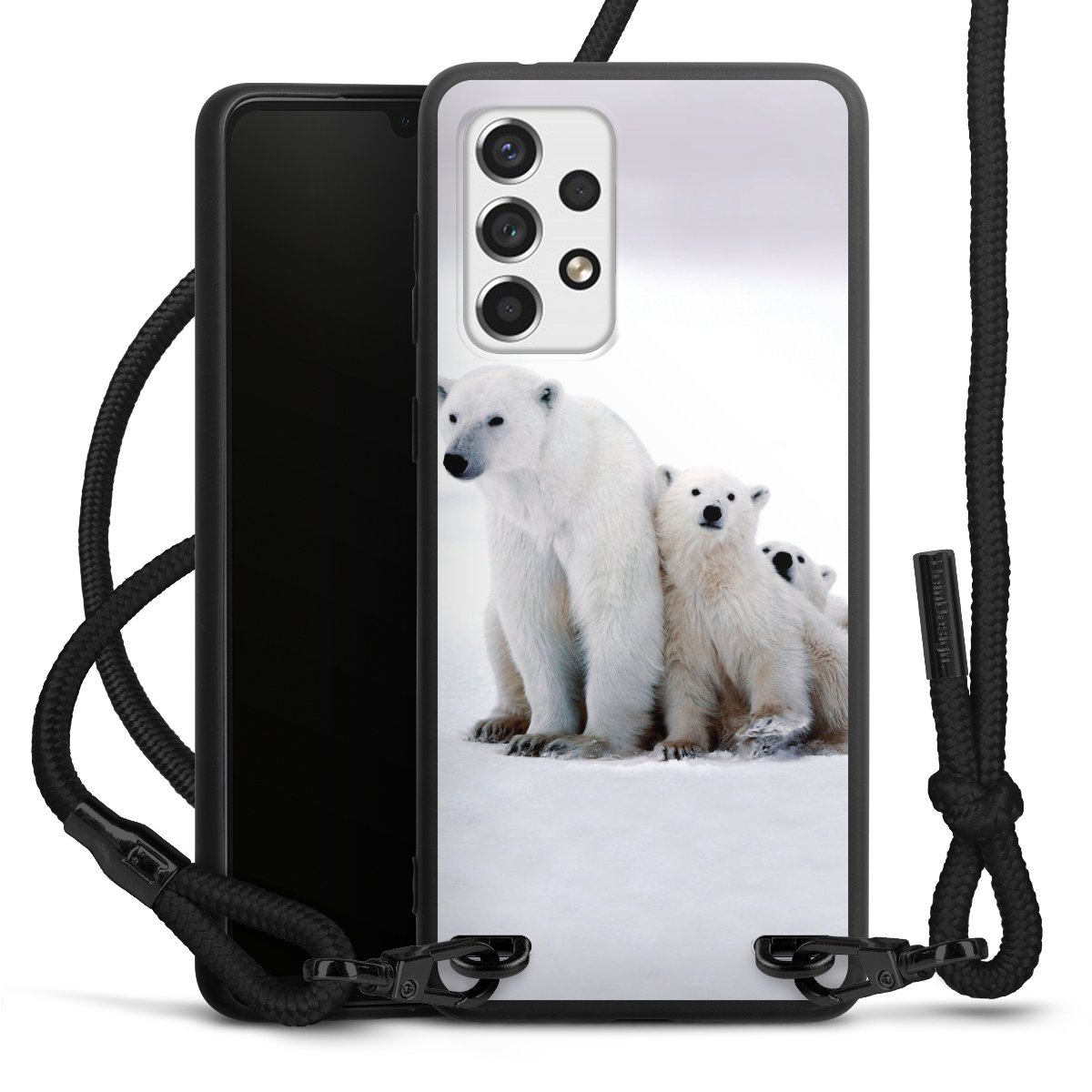 The matt black silicone case is made of flexible TPU (thermoplastic polyurethane) and offers robust protection. The durable, unbreakable material makes the cover flexible and dimensionally stable at the same time. The matte surface makes your design stand out more and is less susceptible to fingerprints and dirt. The stylish trend accessory fits comfortably in the hand and is perfectly complemented by the fabric (polyester) mobile phone strap. The braided fabric strap is approx. 1.70 metres long with a diameter of approx. 0.5 cm. Due to the special knotting technique, the length of the strap can be adjusted by simply pulling it, so that you can adapt it individually to your wishes. The practical case to wear around your neck is available with the fabric strap in black. As a little icing on the cake, we have provided the strap with a chic metal fastener in matt black. The strap is securely fastened to the case with loops made of high-quality genuine leather and press studs. The ends of the fabric strap are covered with metallic end caps and thus protected from fraying.