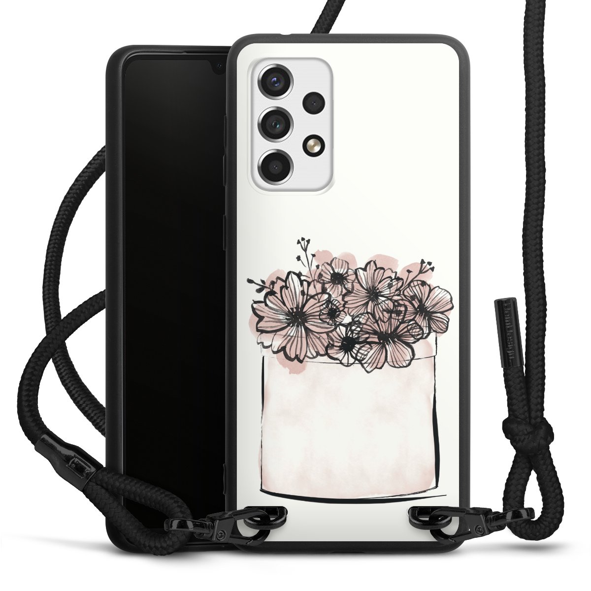 The matt black silicone case is made of flexible TPU (thermoplastic polyurethane) and offers robust protection. The durable, unbreakable material makes the cover flexible and dimensionally stable at the same time. The matte surface makes your design stand out more and is less susceptible to fingerprints and dirt. The stylish trend accessory fits comfortably in the hand and is perfectly complemented by the fabric (polyester) mobile phone strap. The braided fabric strap is approx. 1.70 metres long with a diameter of approx. 0.5 cm. Due to the special knotting technique, the length of the strap can be adjusted by simply pulling it, so that you can adapt it individually to your wishes. The practical case to wear around your neck is available with the fabric strap in black. As a little icing on the cake, we have provided the strap with a chic metal fastener in matt black. The strap is securely fastened to the case with loops made of high-quality genuine leather and press studs. The ends of the fabric strap are covered with metallic end caps and thus protected from fraying.