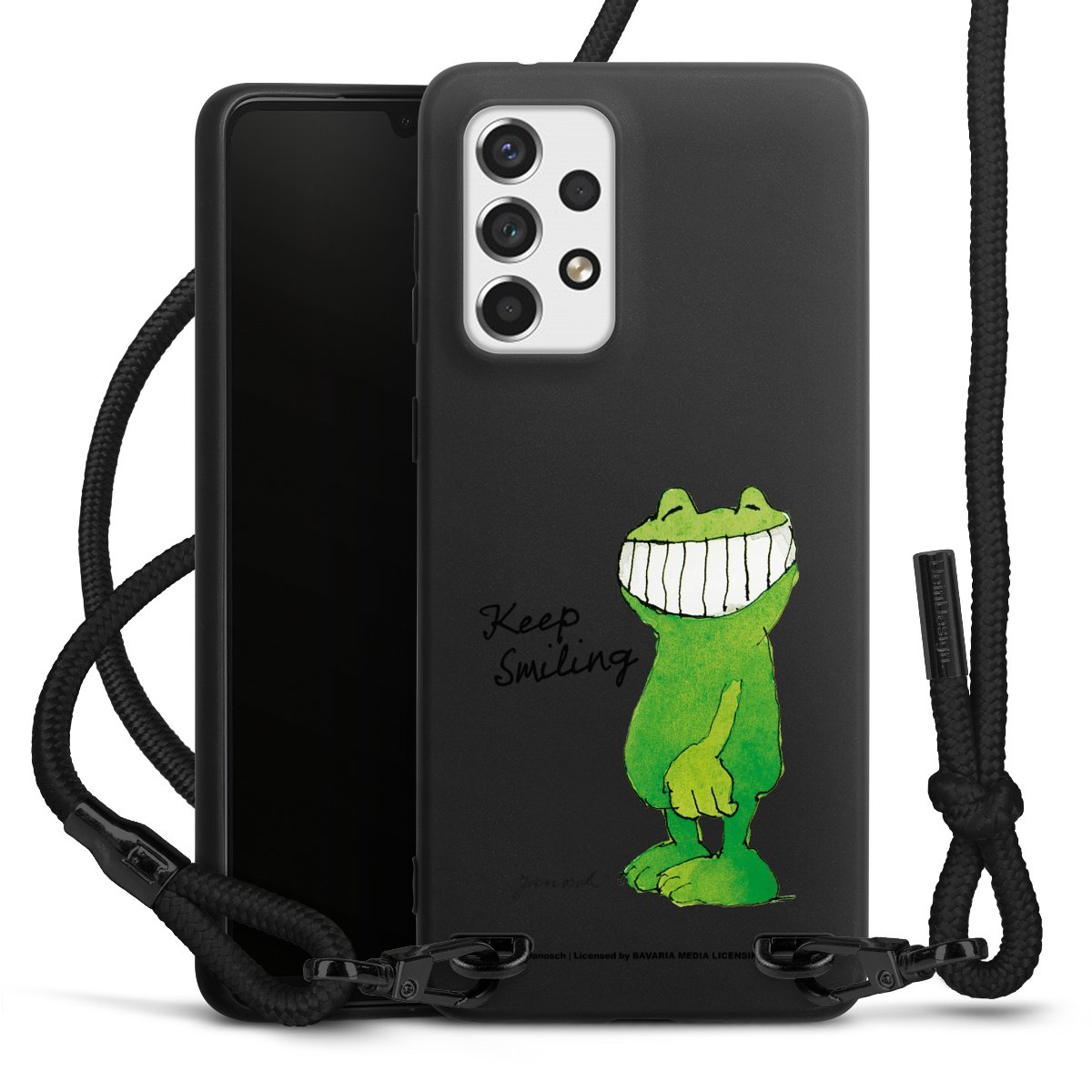 The matt black silicone case is made of flexible TPU (thermoplastic polyurethane) and offers robust protection. The durable, unbreakable material makes the cover flexible and dimensionally stable at the same time. The matte surface makes your design stand out more and is less susceptible to fingerprints and dirt. The stylish trend accessory fits comfortably in the hand and is perfectly complemented by the fabric (polyester) mobile phone strap. The braided fabric strap is approx. 1.70 metres long with a diameter of approx. 0.5 cm. Due to the special knotting technique, the length of the strap can be adjusted by simply pulling it, so that you can adapt it individually to your wishes. The practical case to wear around your neck is available with the fabric strap in black. As a little icing on the cake, we have provided the strap with a chic metal fastener in matt black. The strap is securely fastened to the case with loops made of high-quality genuine leather and press studs. The ends of the fabric strap are covered with metallic end caps and thus protected from fraying.