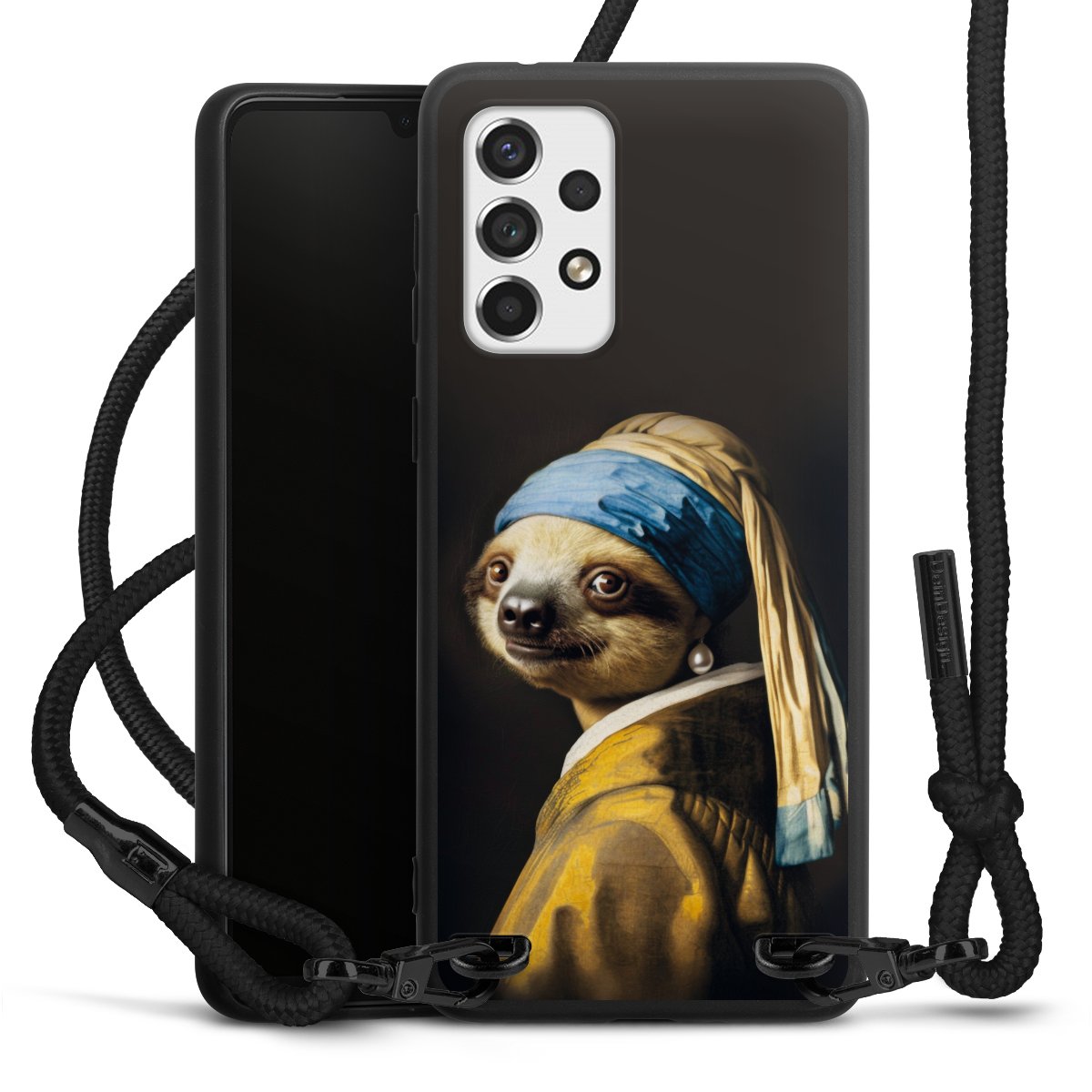 The matt black silicone case is made of flexible TPU (thermoplastic polyurethane) and offers robust protection. The durable, unbreakable material makes the cover flexible and dimensionally stable at the same time. The matte surface makes your design stand out more and is less susceptible to fingerprints and dirt. The stylish trend accessory fits comfortably in the hand and is perfectly complemented by the fabric (polyester) mobile phone strap. The braided fabric strap is approx. 1.70 metres long with a diameter of approx. 0.5 cm. Due to the special knotting technique, the length of the strap can be adjusted by simply pulling it, so that you can adapt it individually to your wishes. The practical case to wear around your neck is available with the fabric strap in black. As a little icing on the cake, we have provided the strap with a chic metal fastener in matt black. The strap is securely fastened to the case with loops made of high-quality genuine leather and press studs. The ends of the fabric strap are covered with metallic end caps and thus protected from fraying.